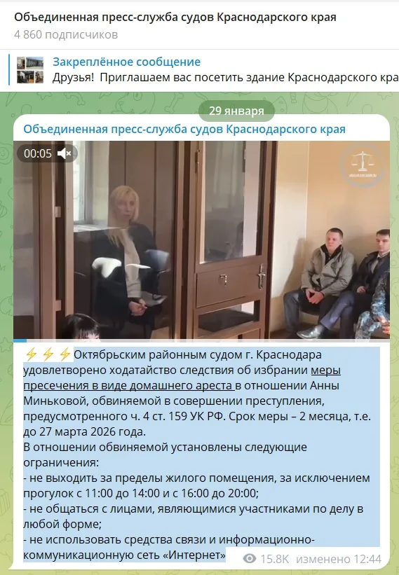 Несмотря на домашний арест и запрет использования средств связи, Анна Минькова остаётся руководителем медиахолднига краевой администрации