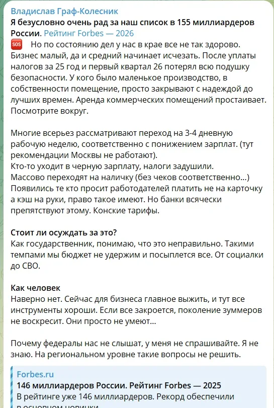«Я безусловно очень рад за наш список в 155 миллиардеров России. Рейтинг Forbes — 2026. Но по состоянию дел у нас в крае все не так здорово», — написал Граф-Колесник в своем телеграм-канале.