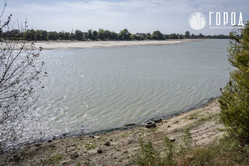 Река Кубань обмелела, обнажив все «прелести» заботы человека о сохранении её акватории. Среди гор мусора сидят рыбаки. Наверное, в надежде поймать какую-нибудь рыбу-мутанта для дорогой продажи.