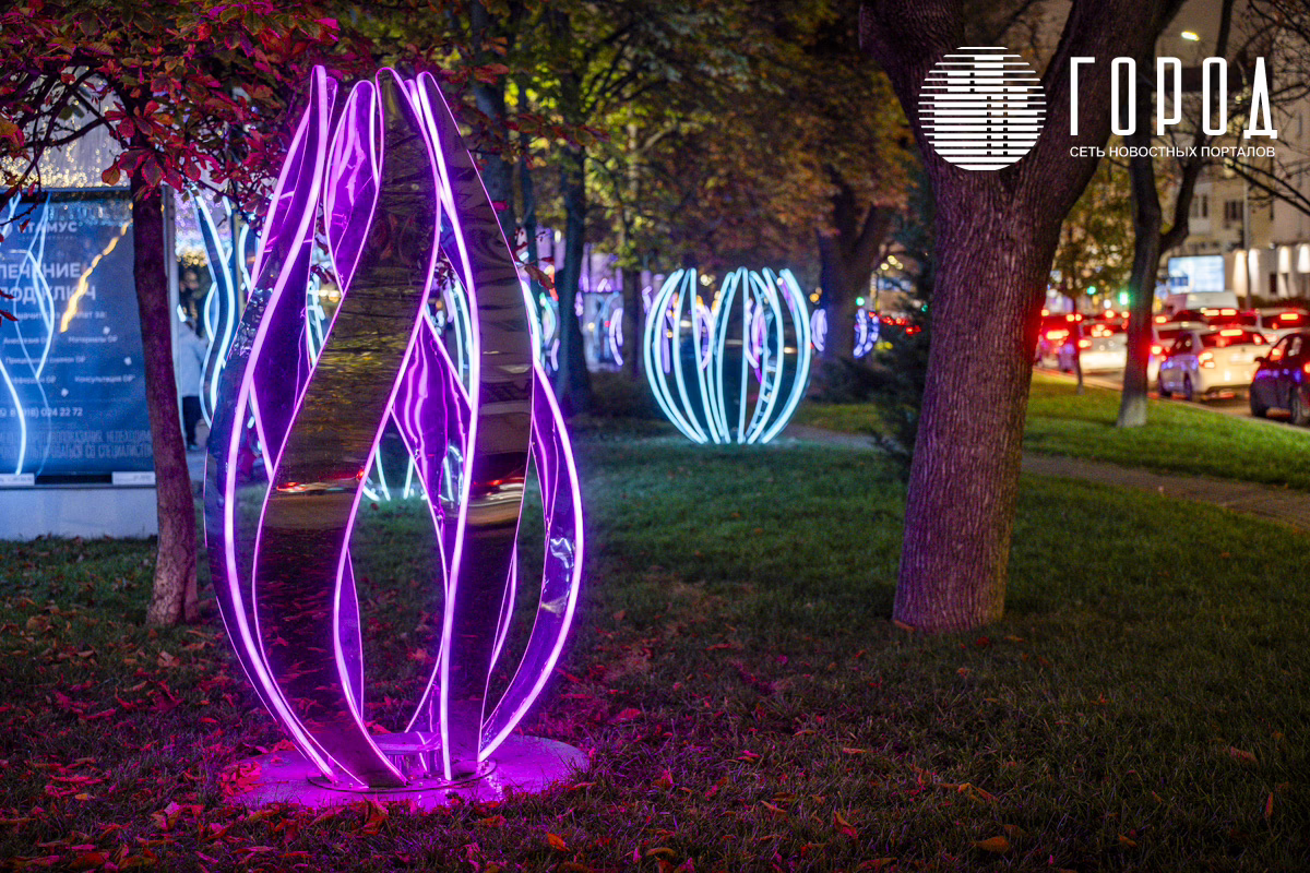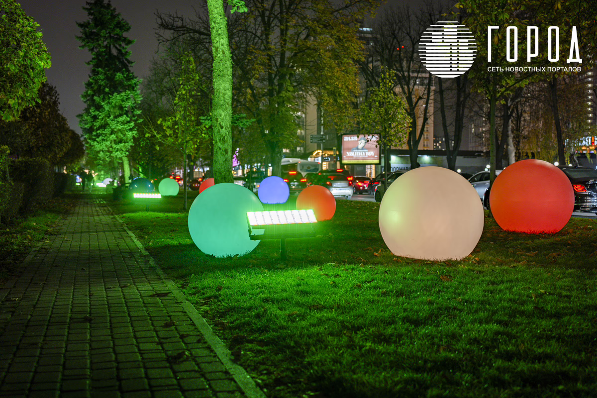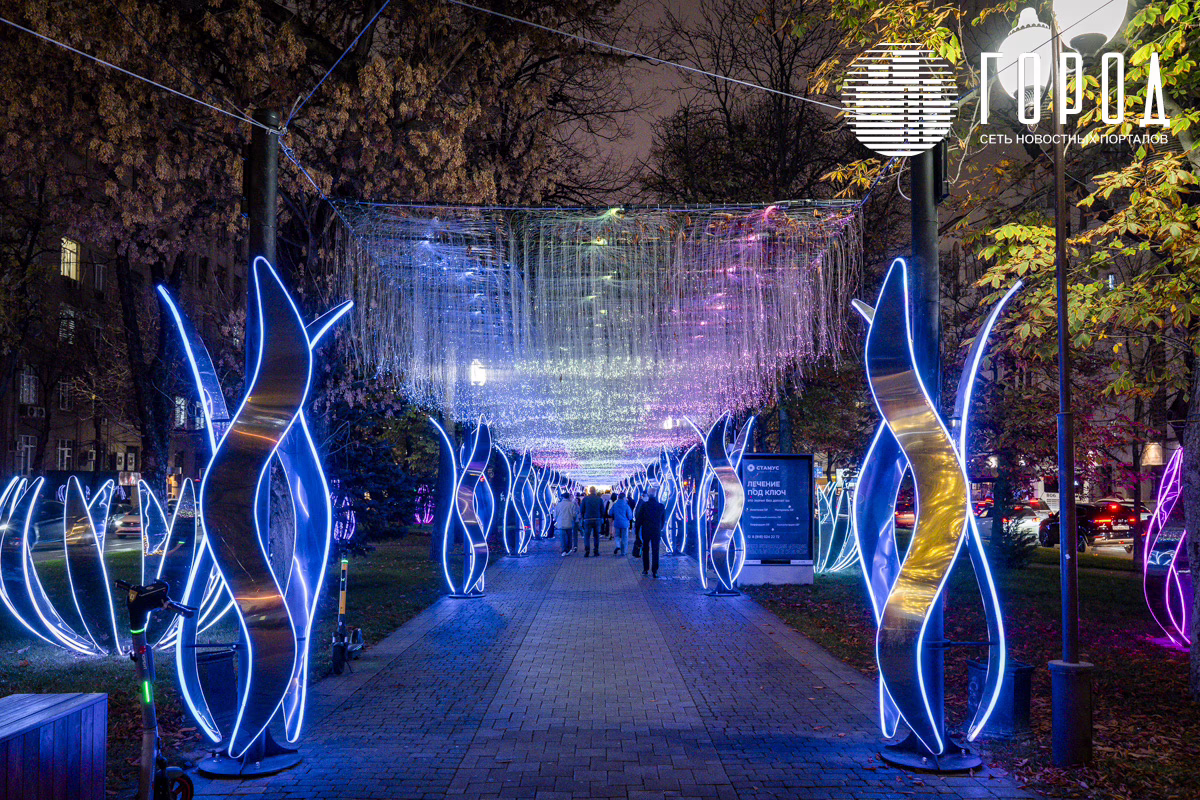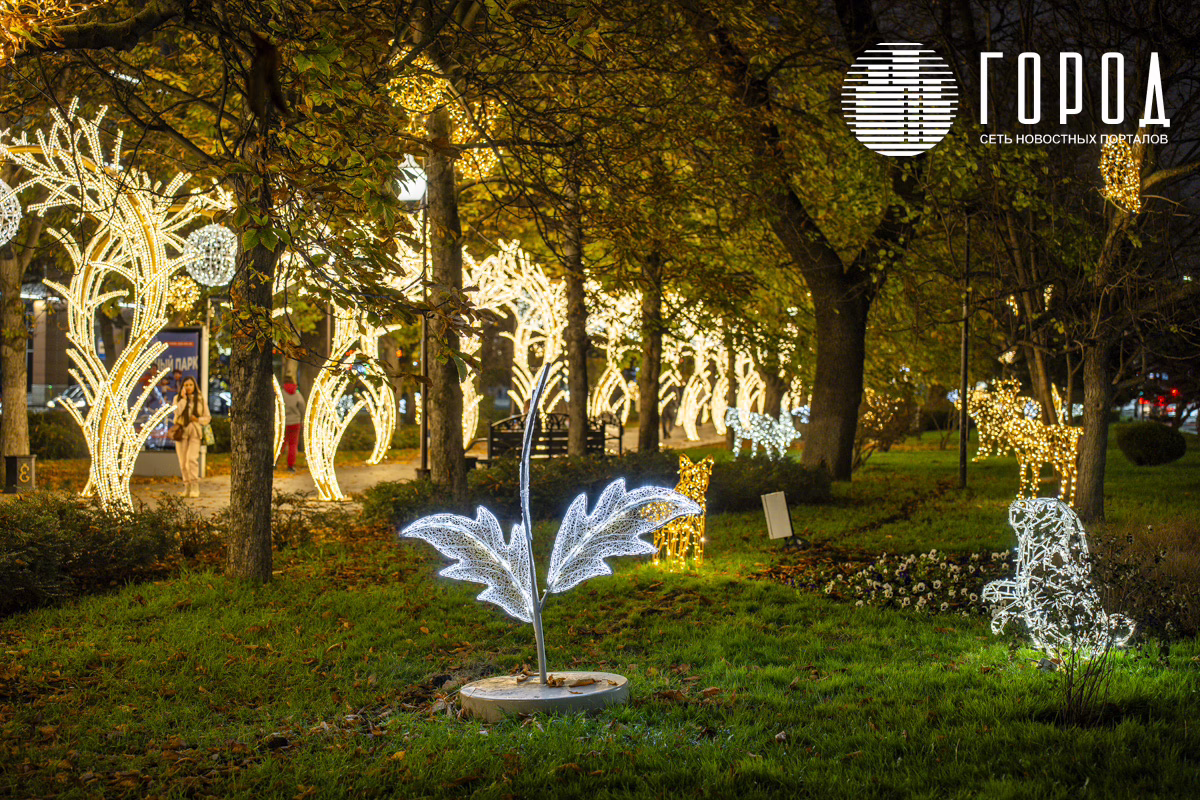 Так, фигуры светящихся медведей, оленей, зайцев, лисиц и других животных собрали на газонах более компактно. Они сейчас не являются дополнением к ярким аркам, а создают самостоятельно в совокупности отдельную локацию. Более масштабным сделали и освещение всего бульвара. На газонах установили прожекторы, которые своим светом окрашивают деревья и газоны в разные цвета радуги. От красного – до зелёного и жёлтого.