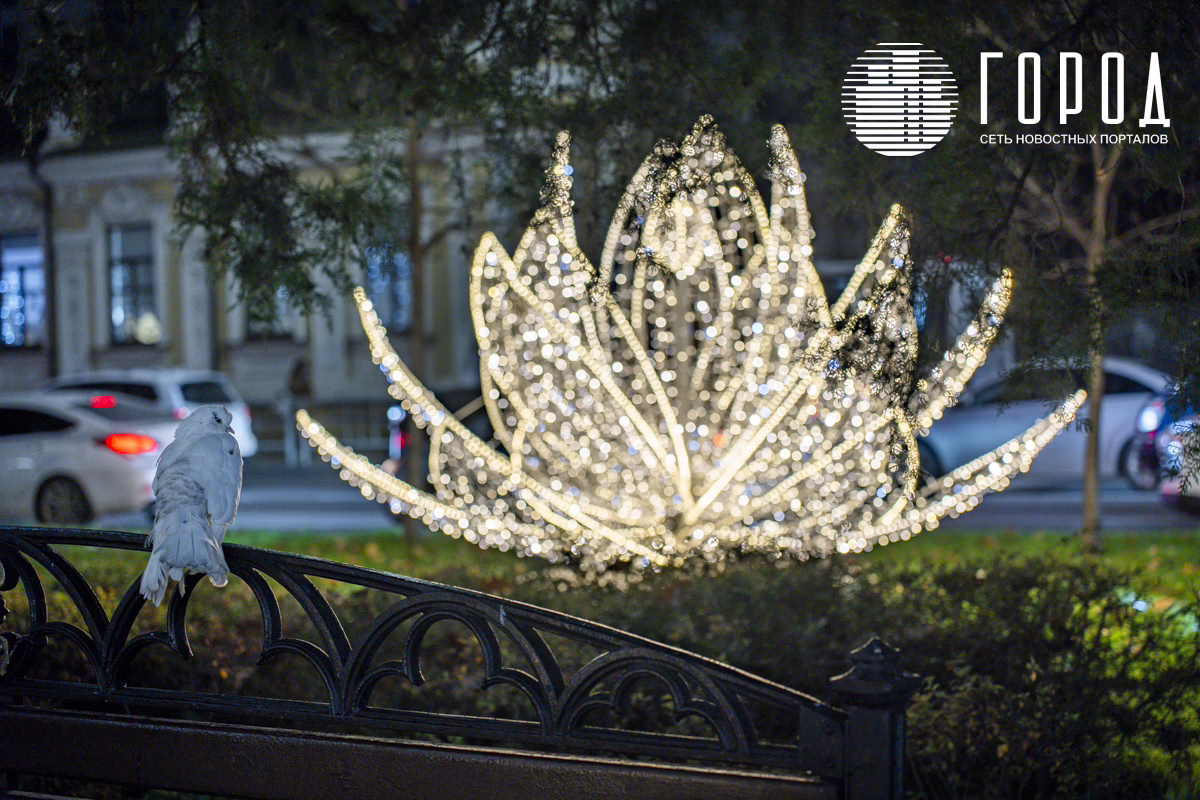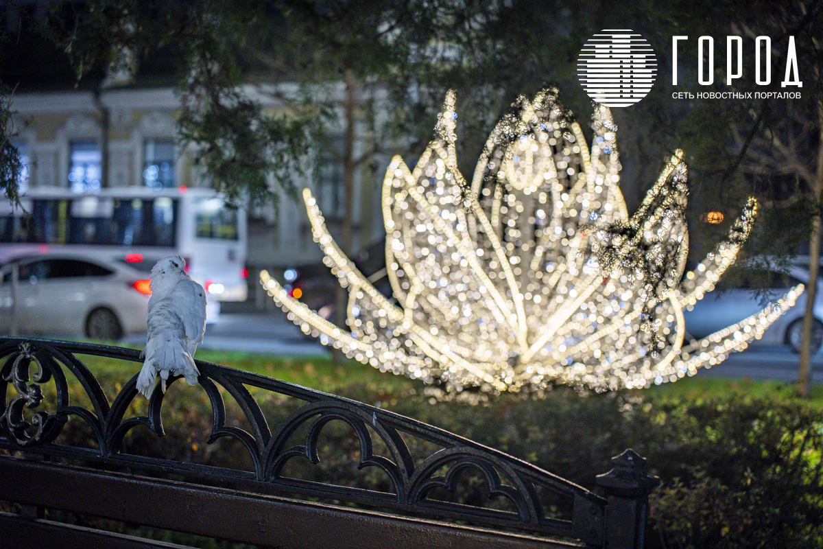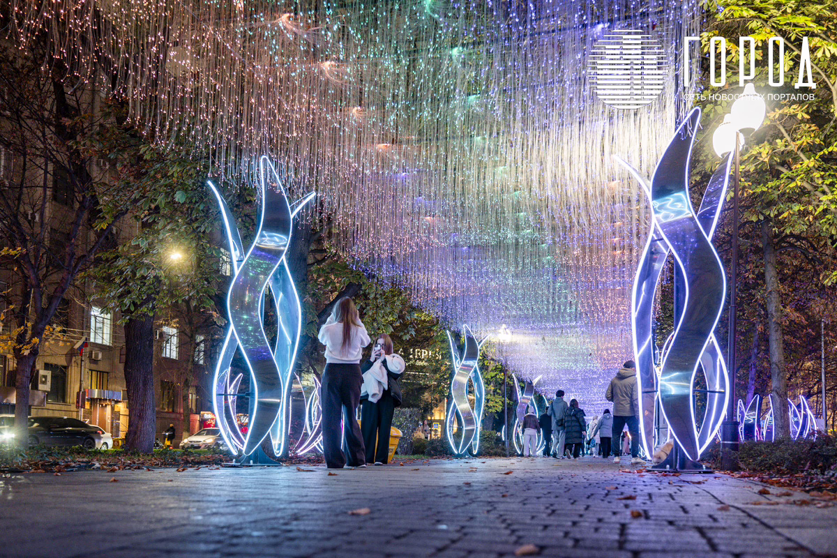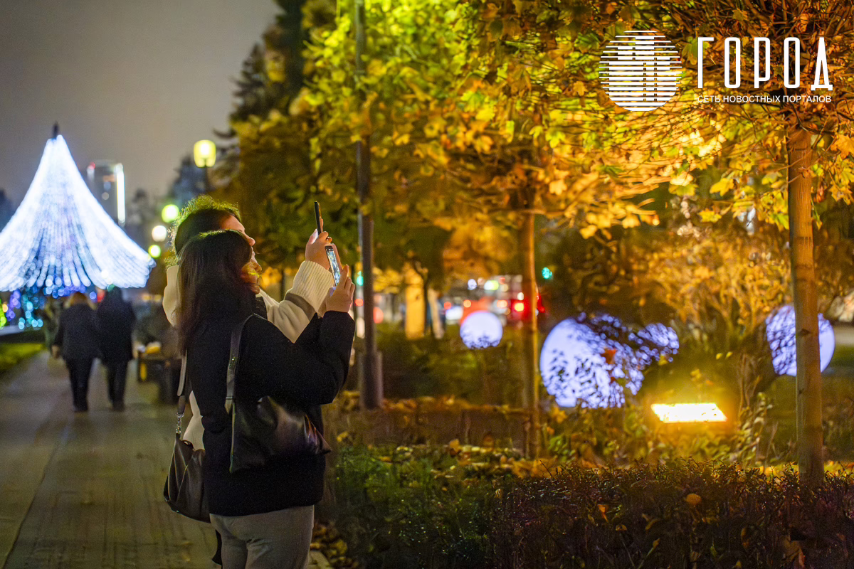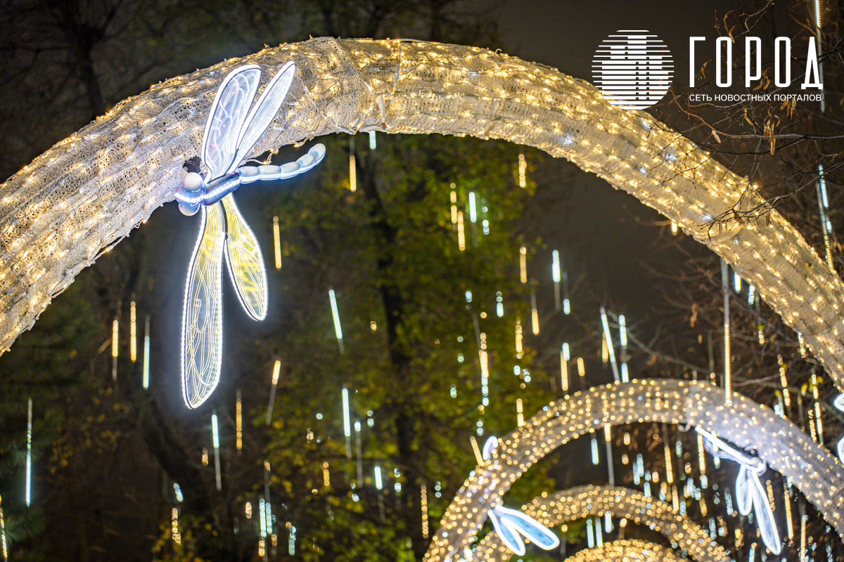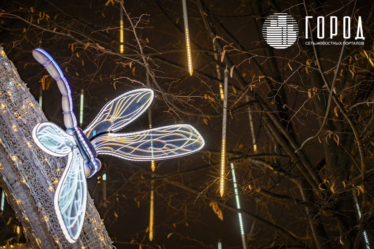 С воскресенья улица Красная на Александровском бульваре второй год подряд засияла яркими огнями. Аллеи самых разнообразных по форме и переливу цветов арок. Поля с фигурами светящихся животных. Огромные стрекозы и совы на них и деревьях. Сотни тысяч горящих отовсюду лампочек. Две новогодние ёлки – одна над памятником Шурику и Лидочке, а вторая из огромных шаров. Переливающийся дождик повсюду, как и звёзды, снежинки, раскрывающиеся лотосы…