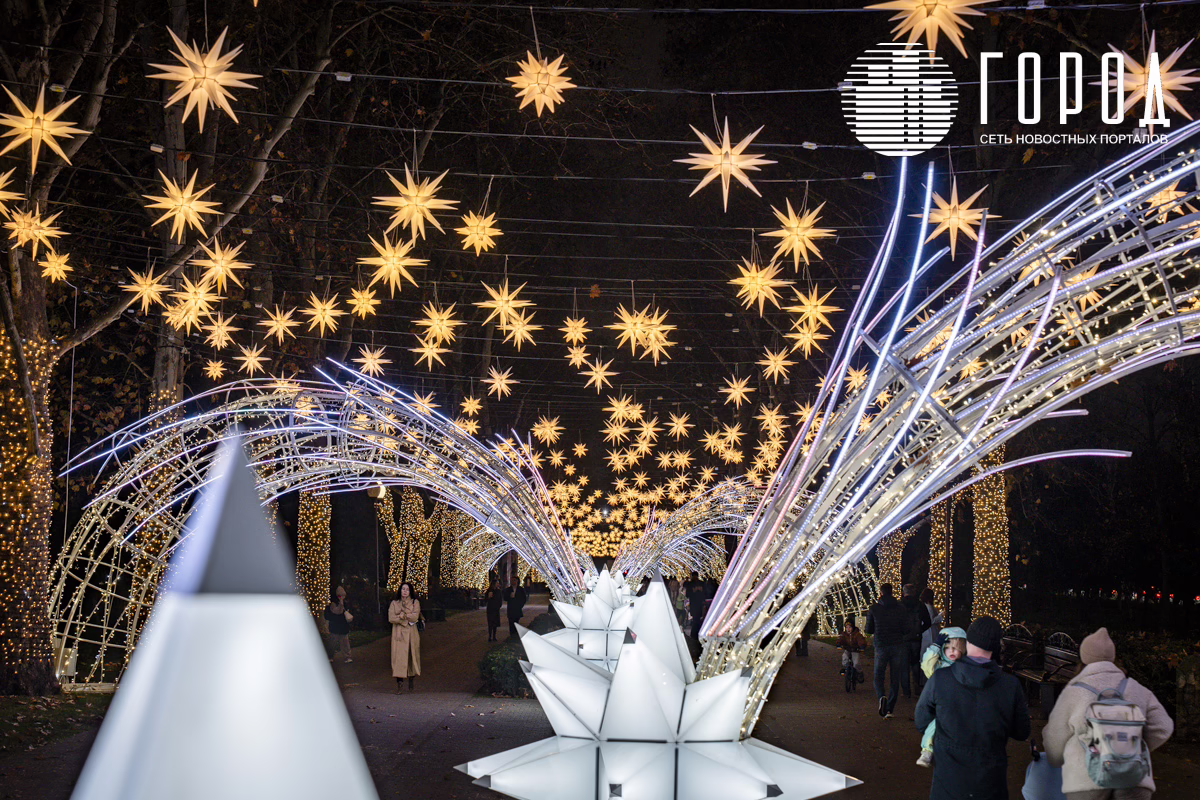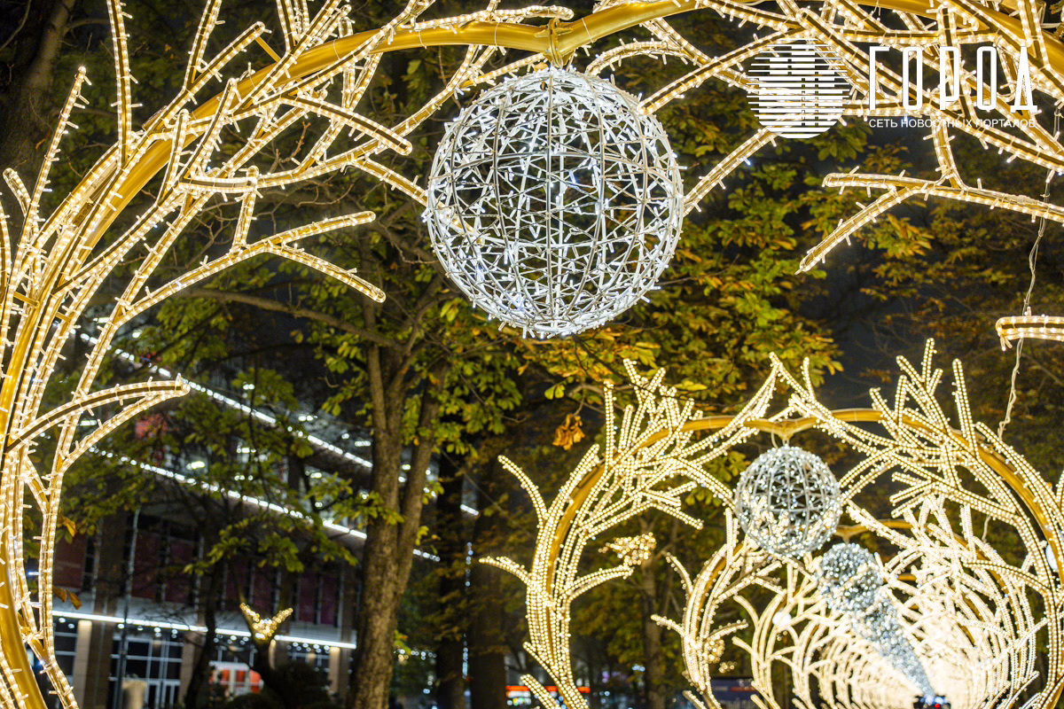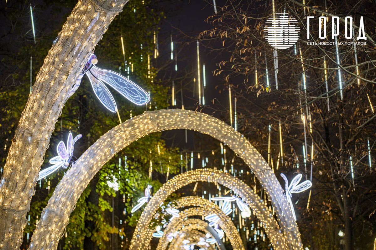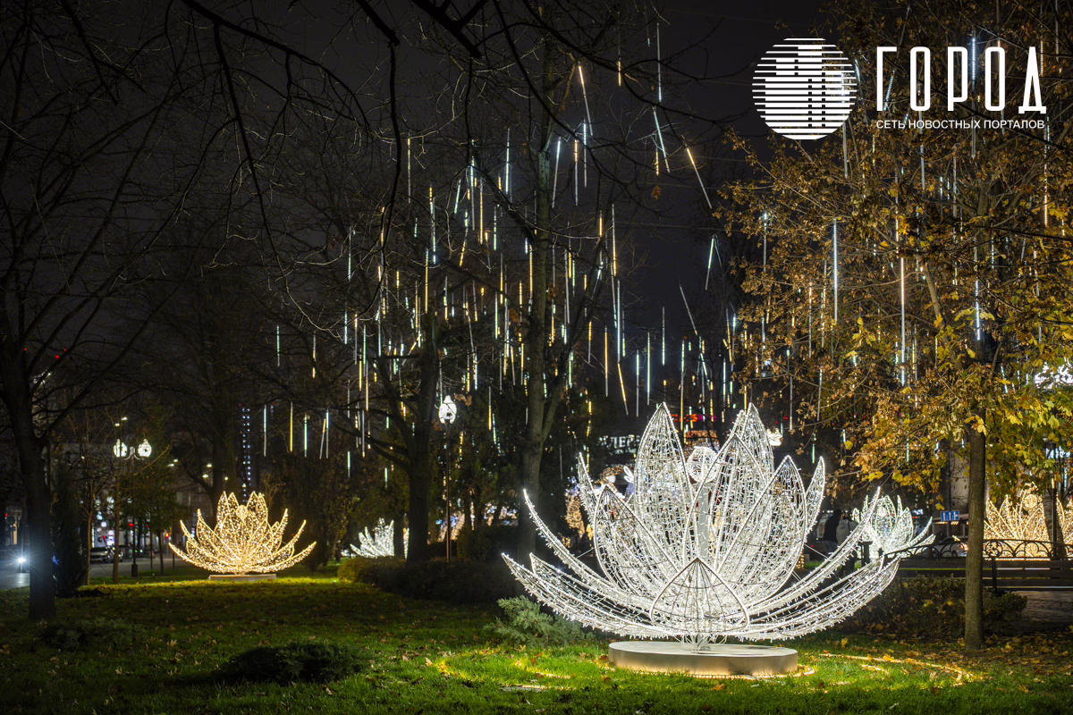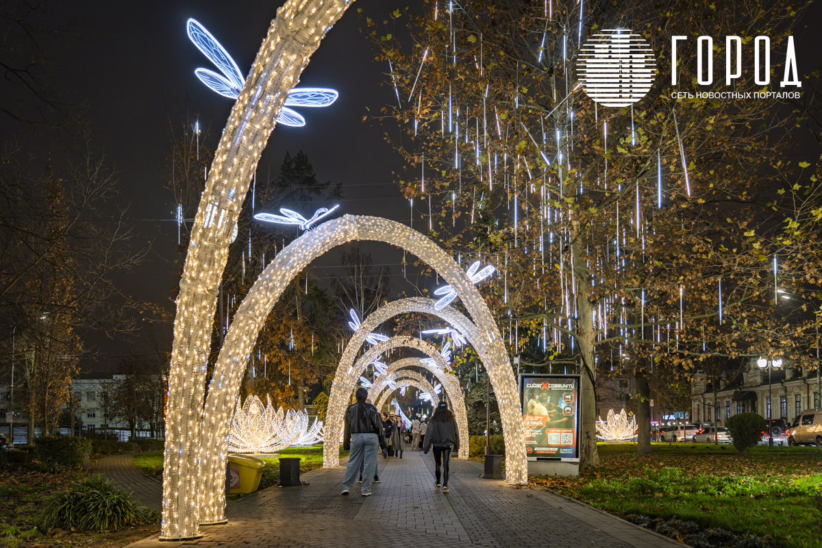 С воскресенья улица Красная на Александровском бульваре второй год подряд засияла яркими огнями. Аллеи самых разнообразных по форме и переливу цветов арок. Поля с фигурами светящихся животных. Огромные стрекозы и совы на них и деревьях. Сотни тысяч горящих отовсюду лампочек. Две новогодние ёлки – одна над памятником Шурику и Лидочке, а вторая из огромных шаров. Переливающийся дождик повсюду, как и звёзды, снежинки, раскрывающиеся лотосы…
