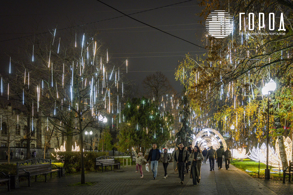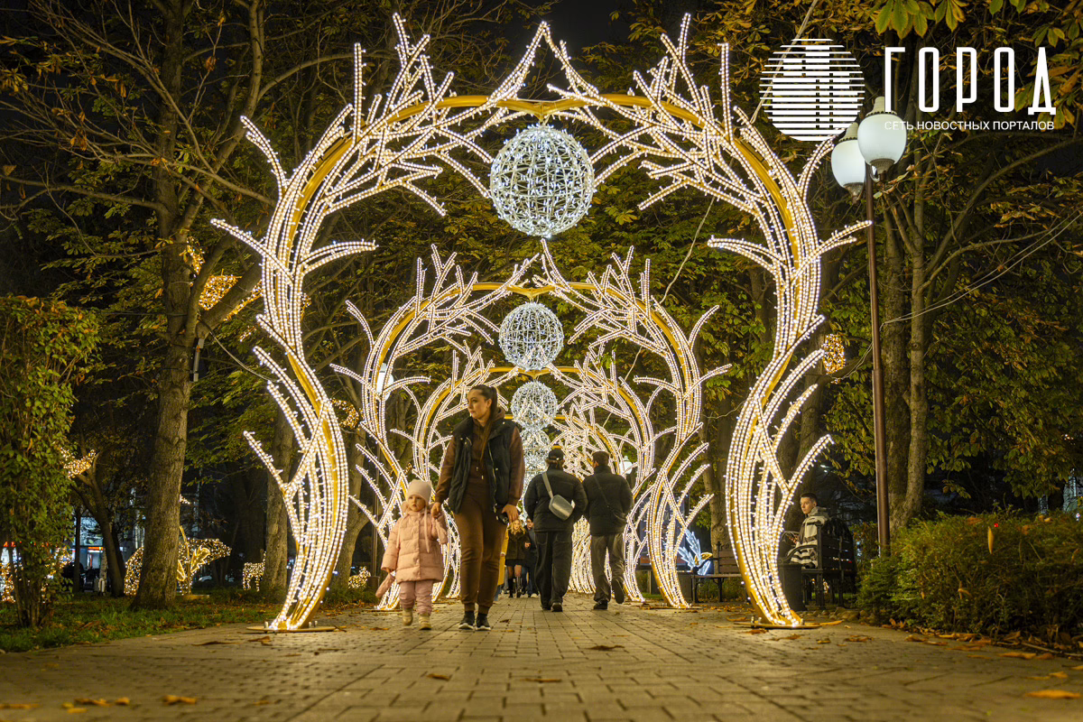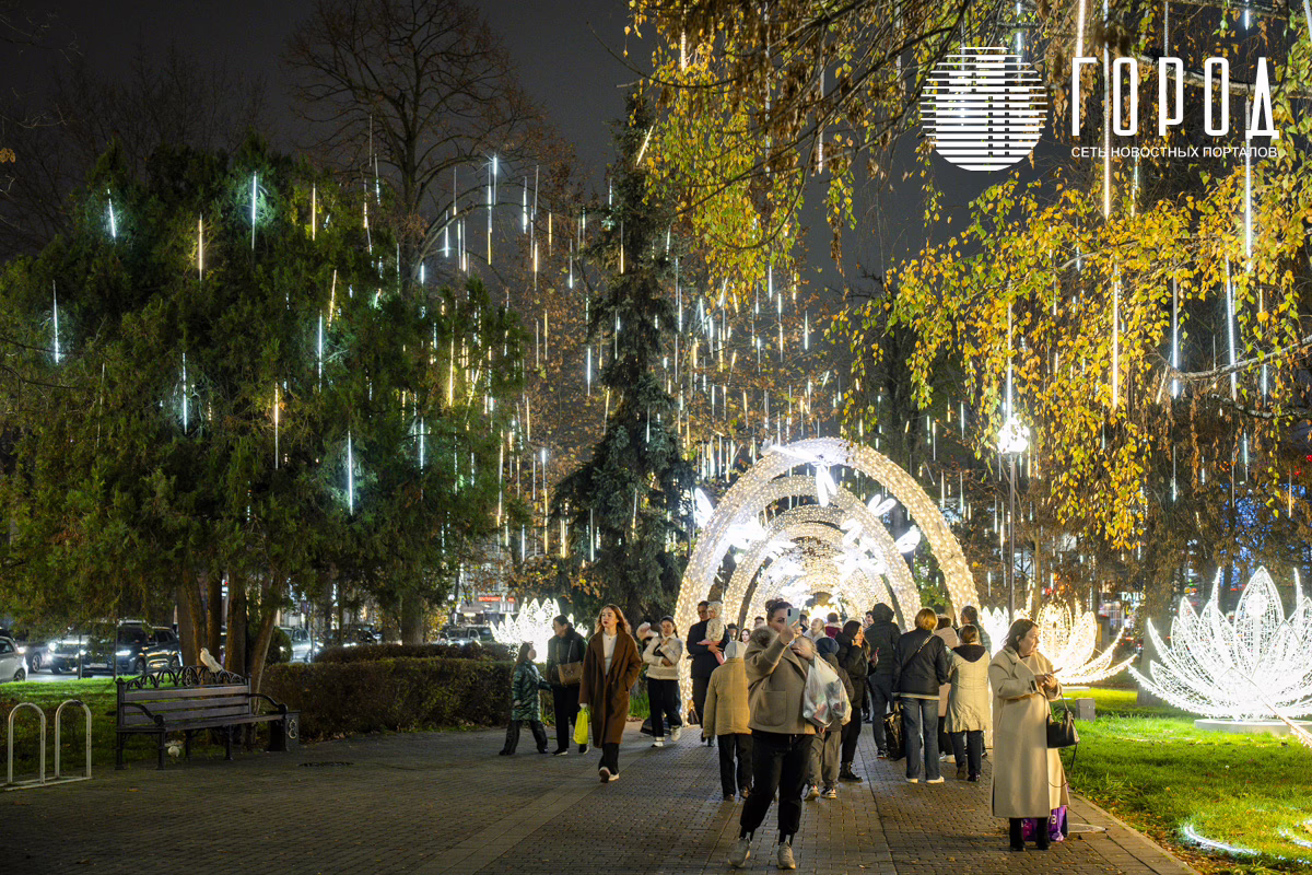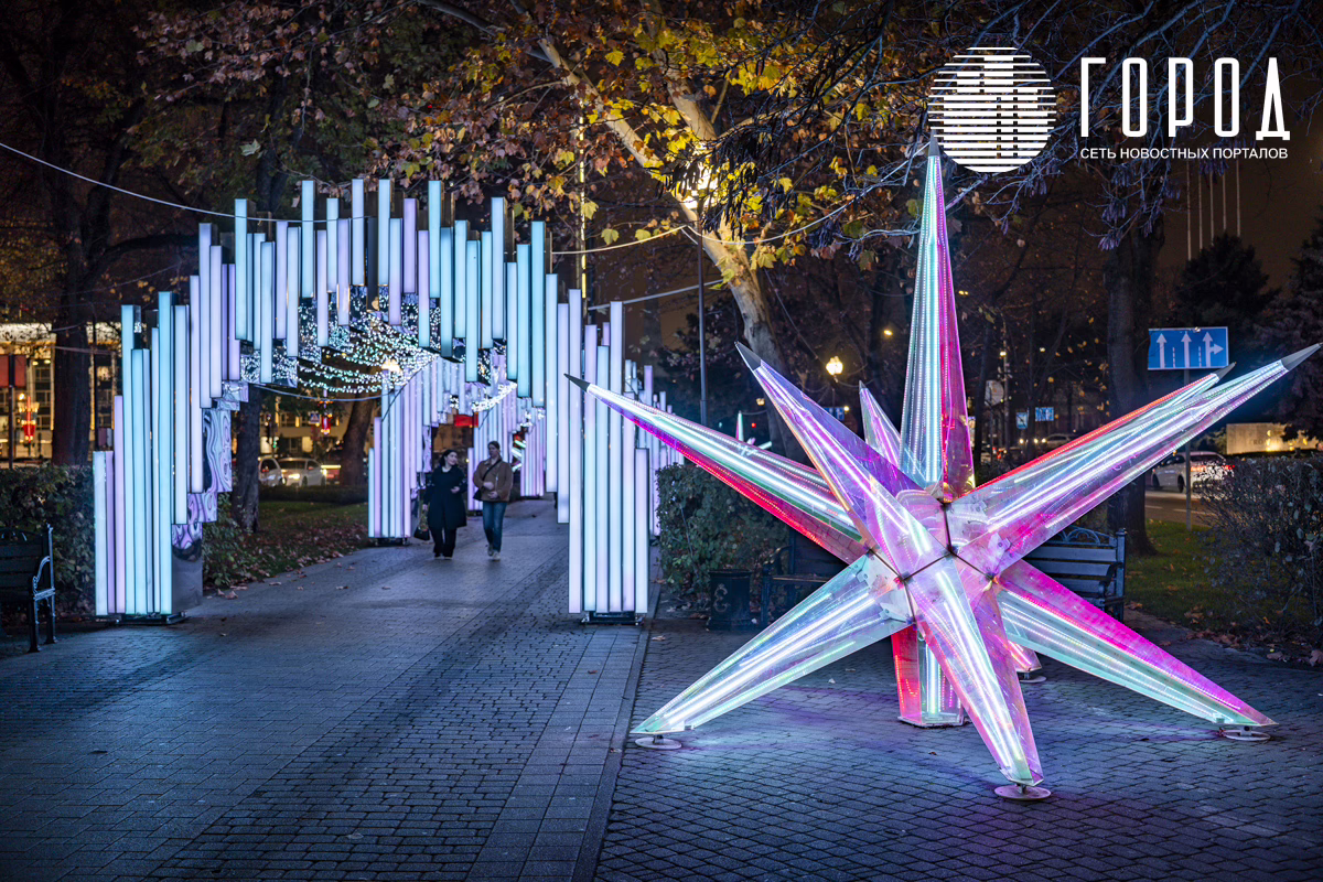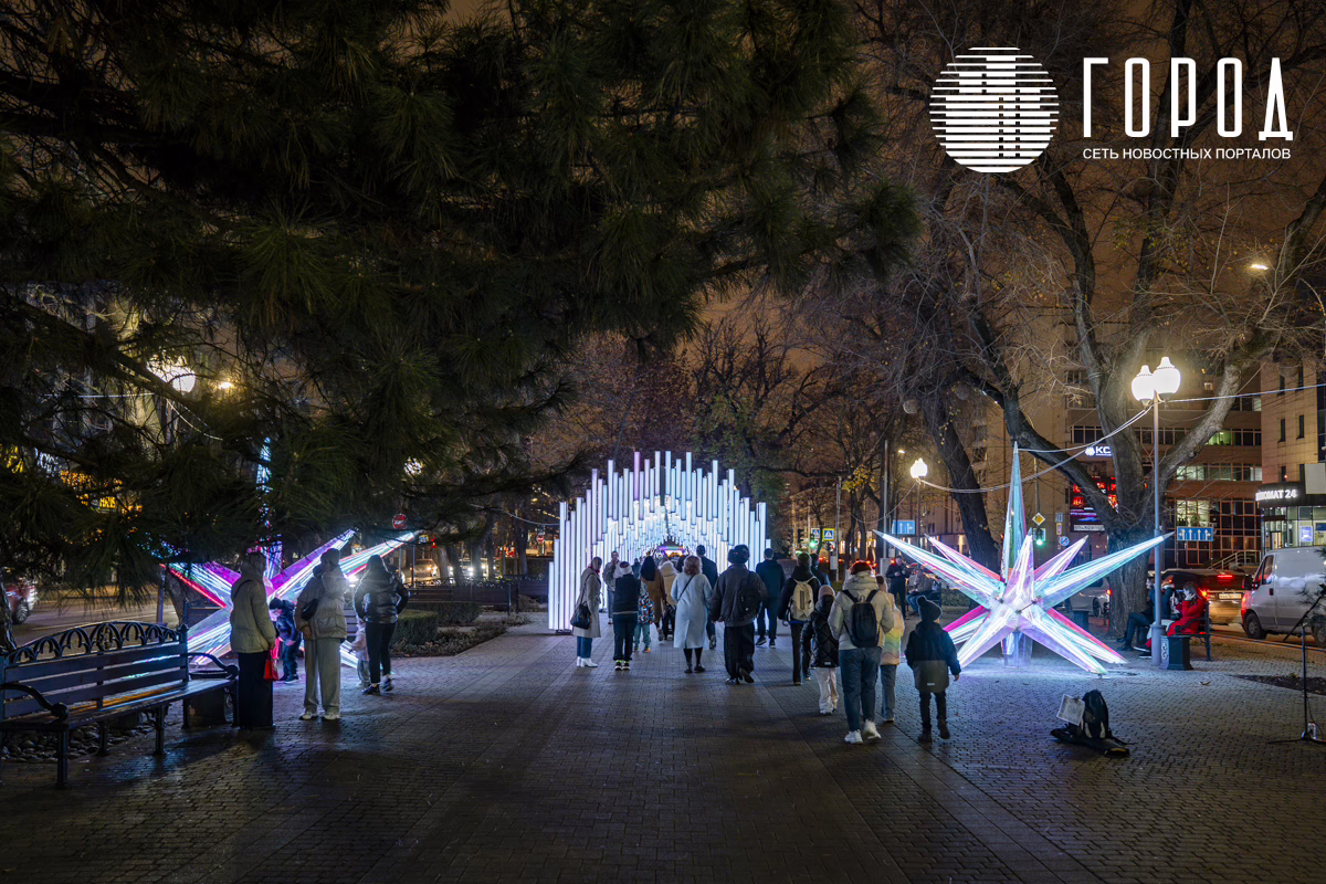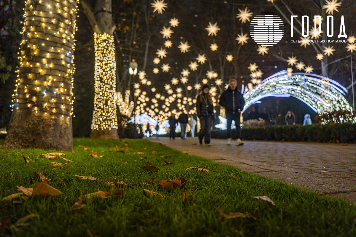 С воскресенья улица Красная на Александровском бульваре второй год подряд засияла яркими огнями. Аллеи самых разнообразных по форме и переливу цветов арок. Поля с фигурами светящихся животных. Огромные стрекозы и совы на них и деревьях. Сотни тысяч горящих отовсюду лампочек. Две новогодние ёлки – одна над памятником Шурику и Лидочке, а вторая из огромных шаров. Переливающийся дождик повсюду, как и звёзды, снежинки, раскрывающиеся лотосы…