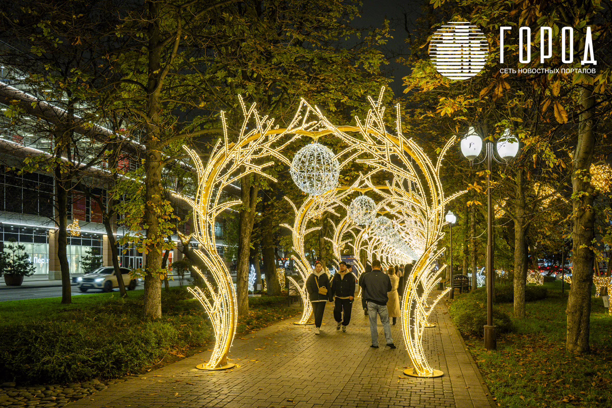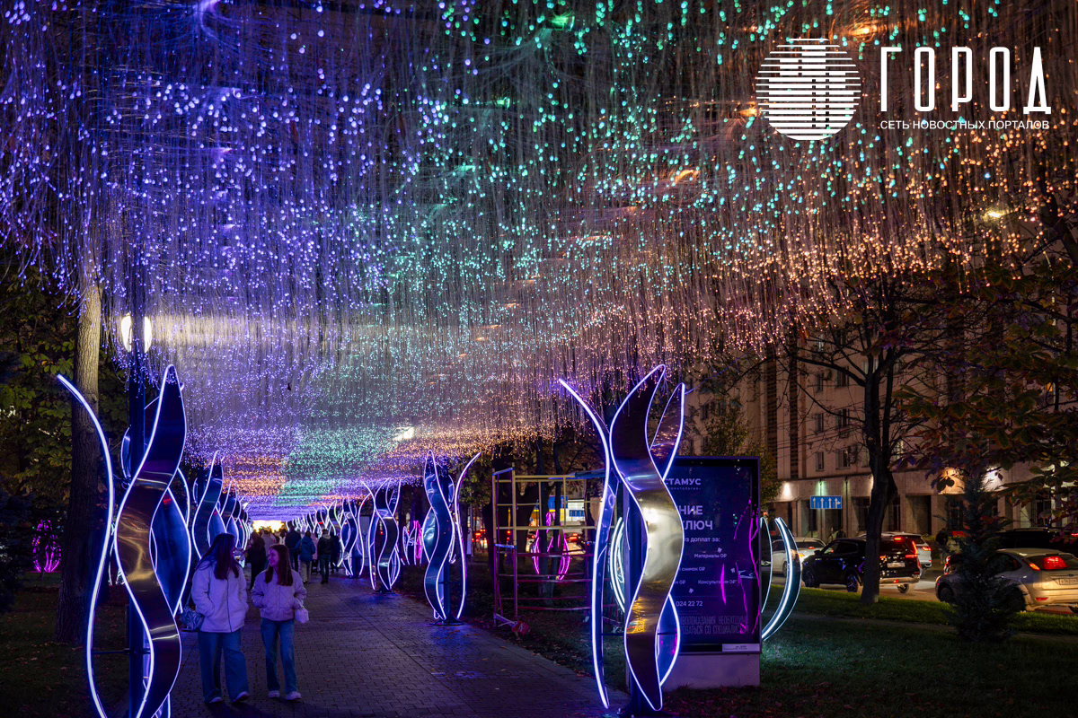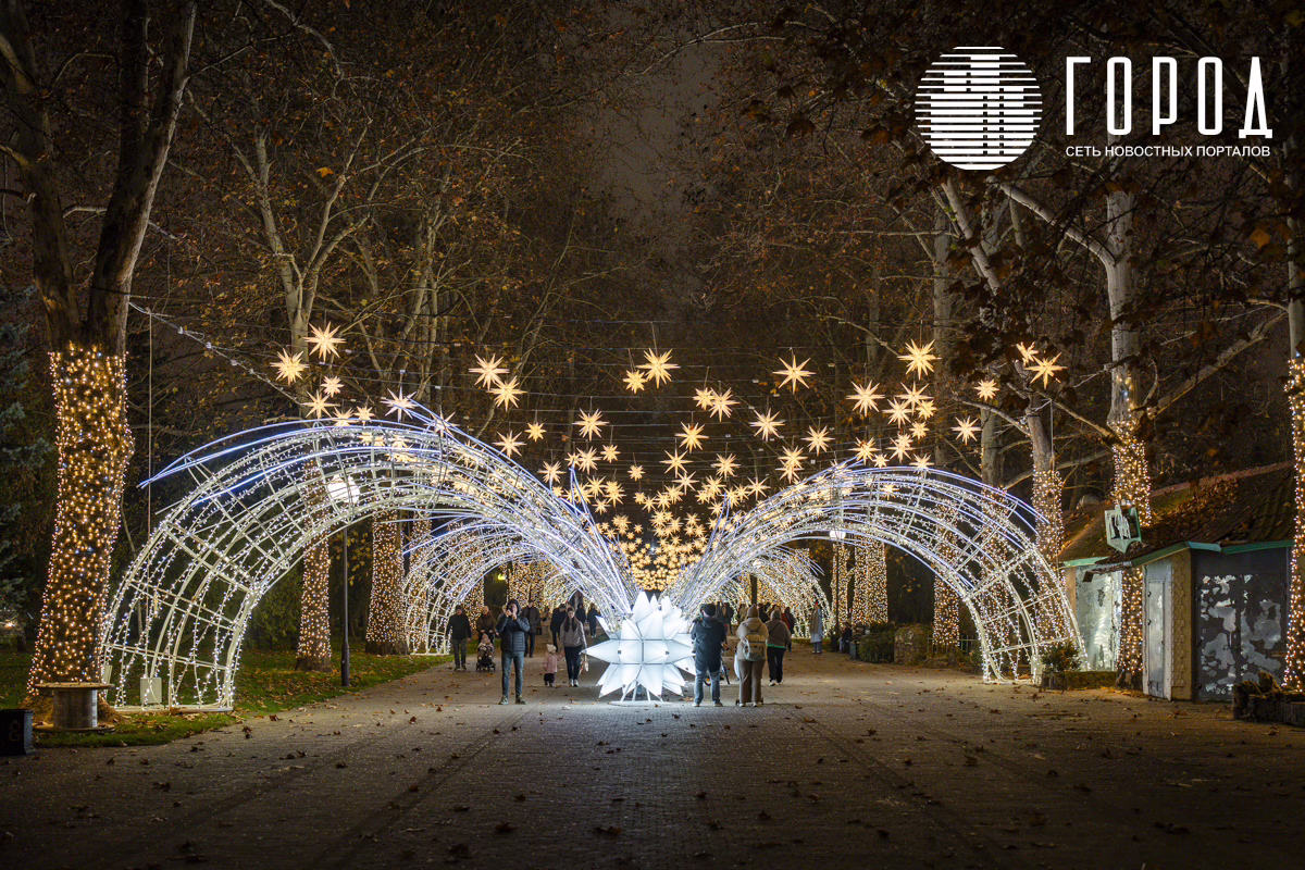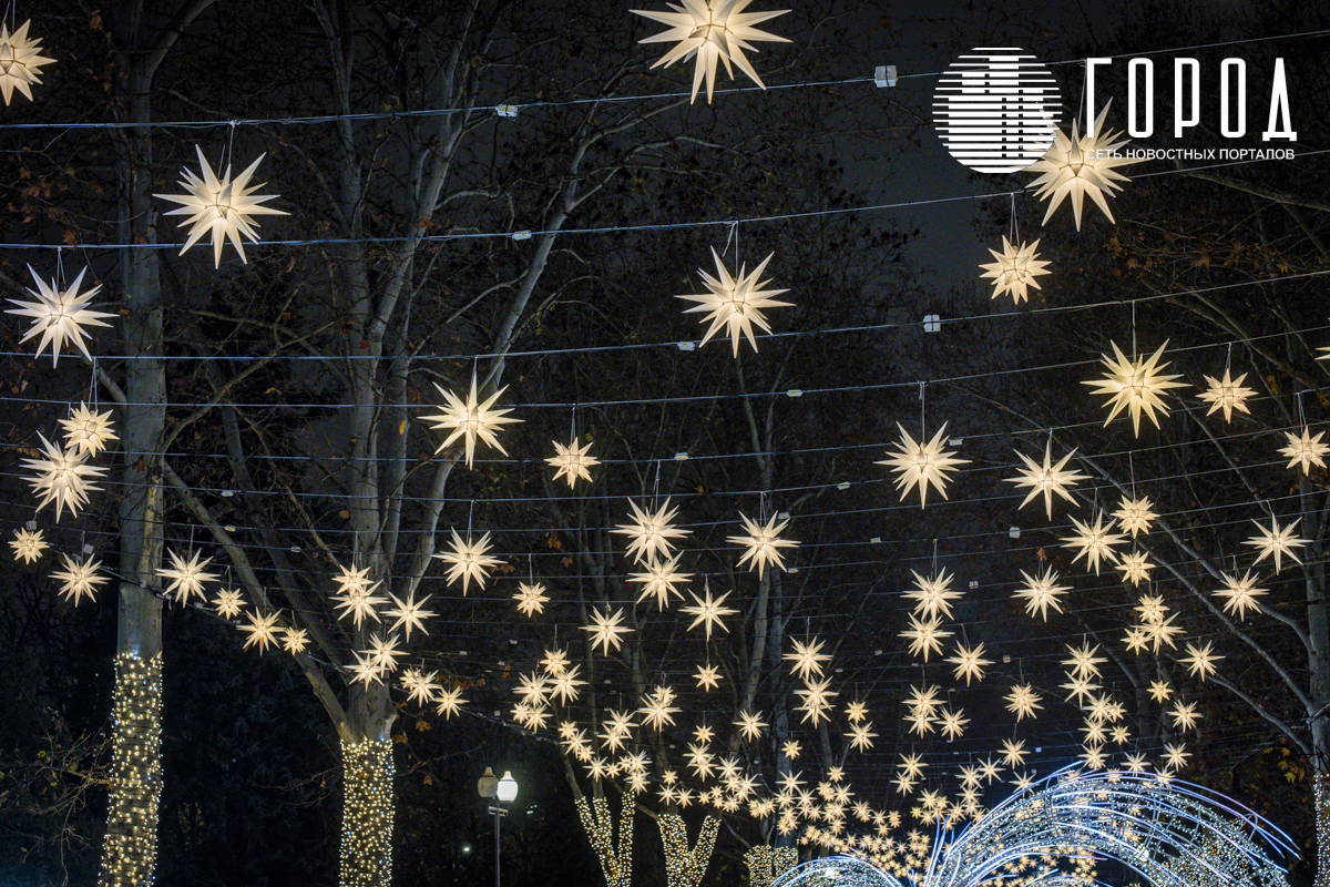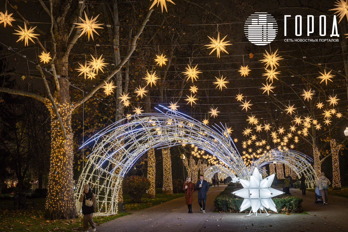 С воскресенья улица Красная на Александровском бульваре второй год подряд засияла яркими огнями. Аллеи самых разнообразных по форме и переливу цветов арок. Поля с фигурами светящихся животных. Огромные стрекозы и совы на них и деревьях. Сотни тысяч горящих отовсюду лампочек. Две новогодние ёлки – одна над памятником Шурику и Лидочке, а вторая из огромных шаров. Переливающийся дождик повсюду, как и звёзды, снежинки, раскрывающиеся лотосы…