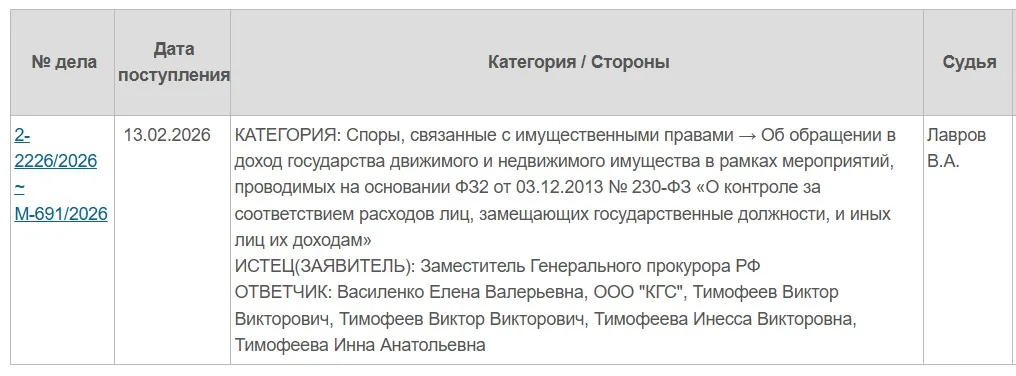 Ответчиками по делу выступают два Виктора Викторовича Тимофеева, Инесса Викторовна Тимофеева, Инна Анатольевна Тимофеева, Елена Валерьевна Василенко и ООО «КГС» — «Кубаньгрузсервис». В качестве третьих лиц заявлены ООО «КГС-Автоцентр» и ООО «КГС-Мол». По всей видимости, эти компании Генпрокуратура требует передать в собственность государства. Предварительное судебное заседание назначено на 26 февраля.