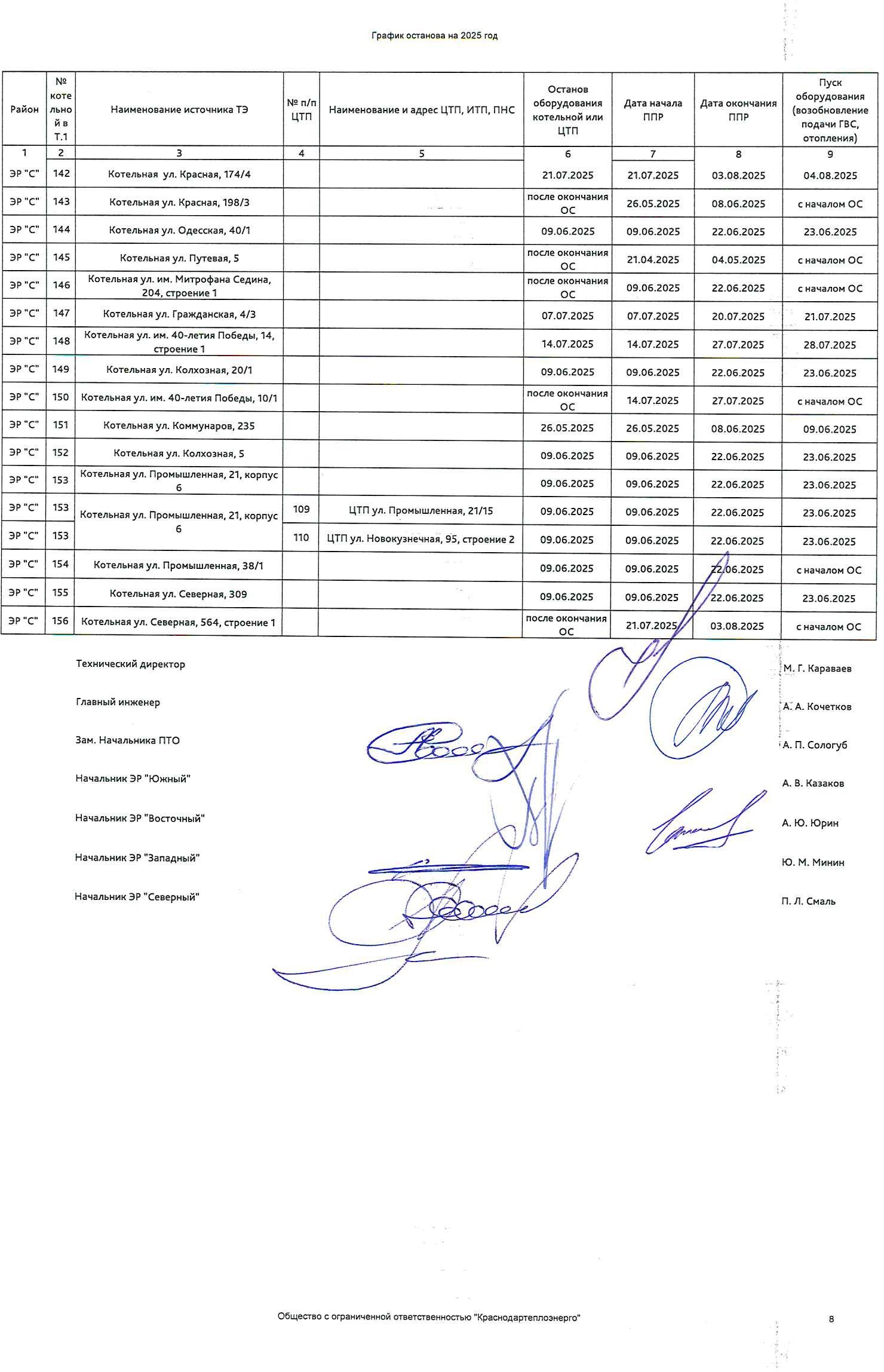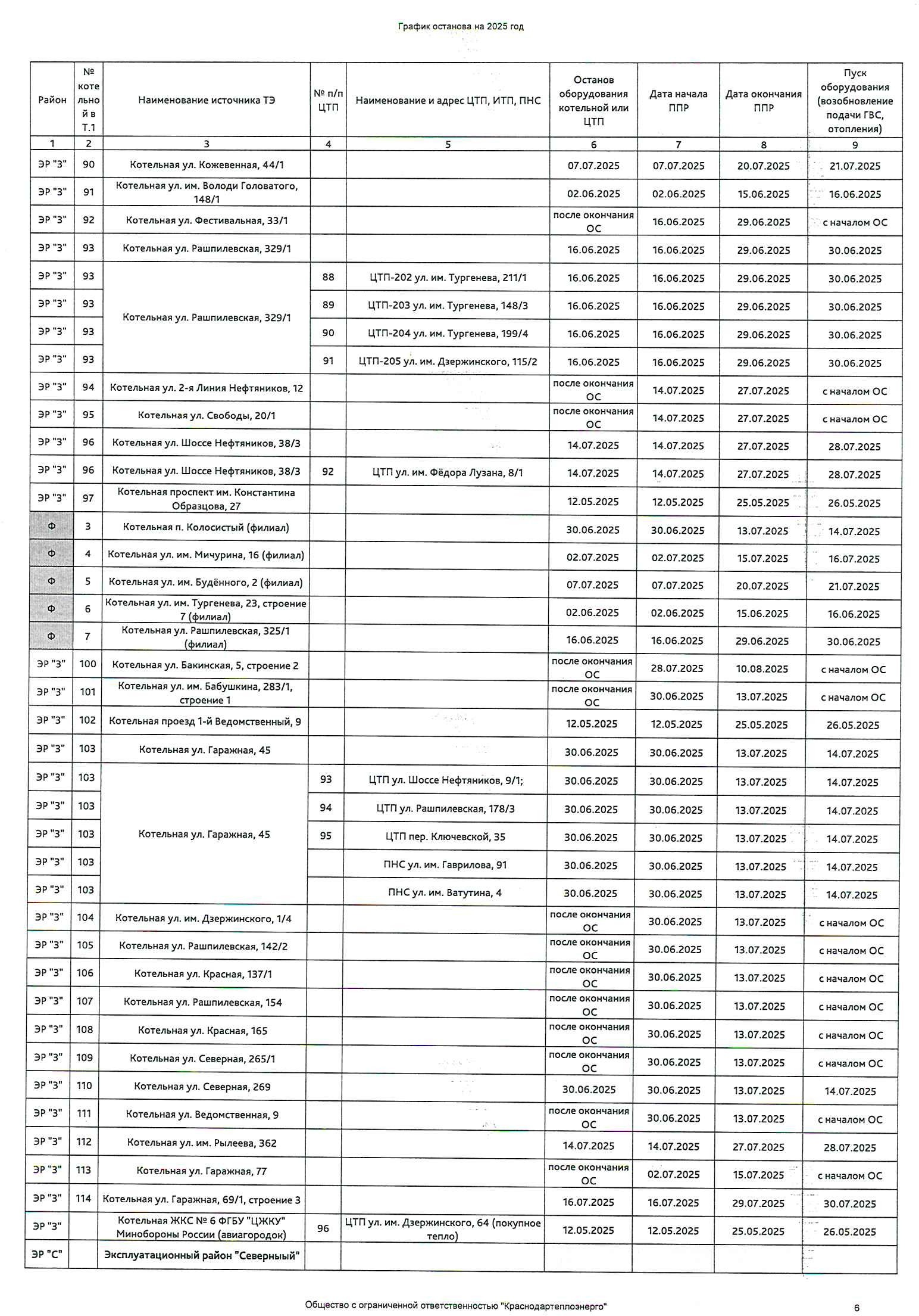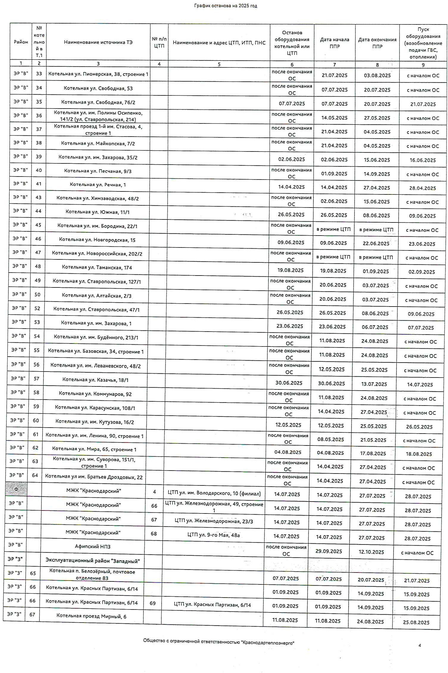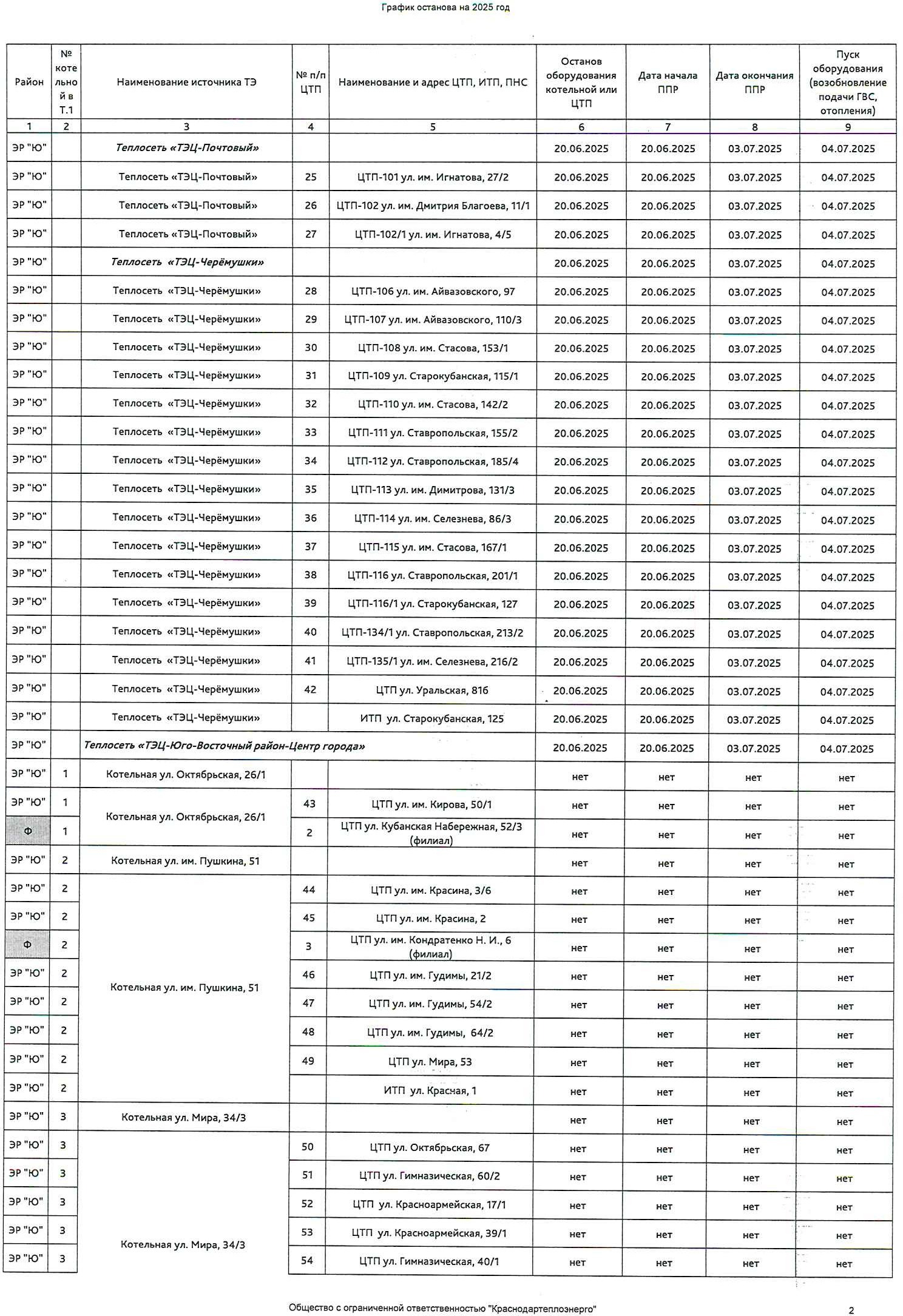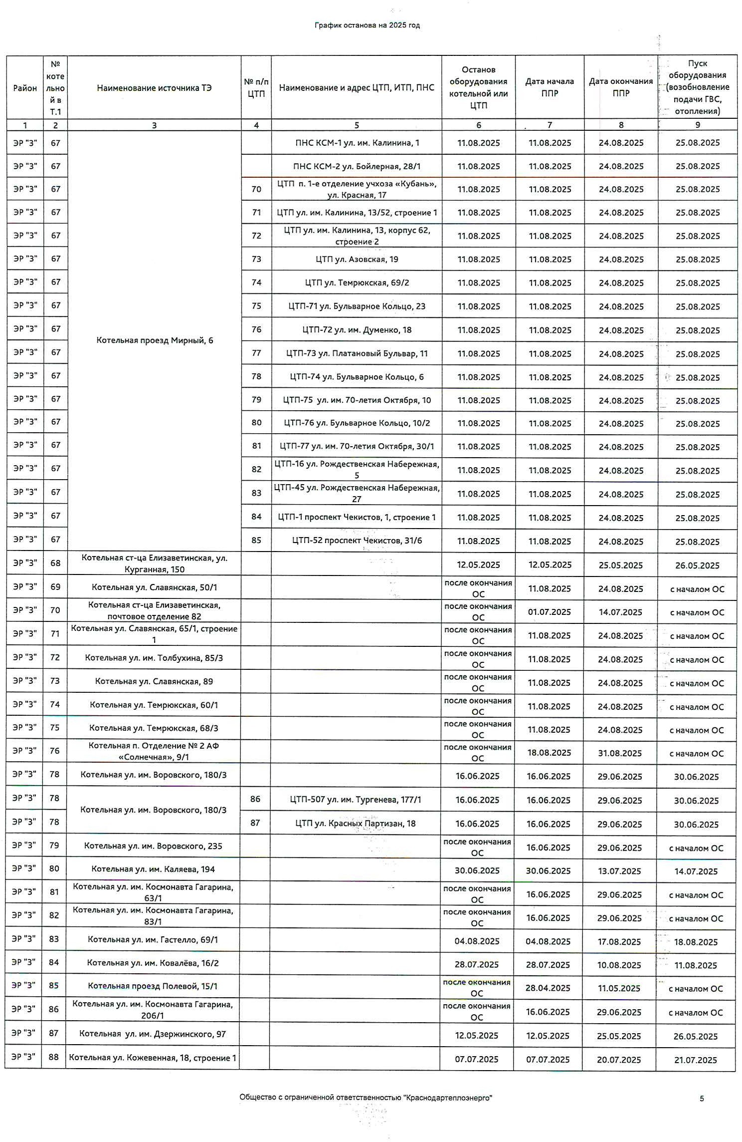 С 16 июня начнутся отключения воды на улицах Тургенева, Красных Партизан, Космонавта Гагарина, Дзержинского, Рашпилевская. С 20 июня по 3 июля перестанут работать котельные на улицах Тюляева, Сормовской, Приозёрной, Уральской, Симферопольской, имени 30-й Иркутской Дивизии, 2-й Заречной, Онежской, Молодёжной, Лавочкина, Новой. Также в списке котельные на улицах Благоева, Игнатова, Айвазовского, Стасова, Ставропольской, Старокубанской, Димитрова, Селезнева, Невкипелова, Гидростроителей. С 14 июля плановые работы пройдут в котельных на улицах Володарского, Железнодорожной, 9-го Мая. Массовые отключения пройдут и с 11 августа. Работы запланированы в котельных на улицах Бойлерная, Калинина, 1-е отделение учхоза «Кубань», Азовская, Темрюкская, Думенко, Бульварное Кольцо, Платановый Бульвар, 70-летия Октября, Рождественская набережная, проспект Чекистов. Ниже публикуем файл с полным графиком двухнедельных отключений воды в котельных Краснодара летом 2025 года.