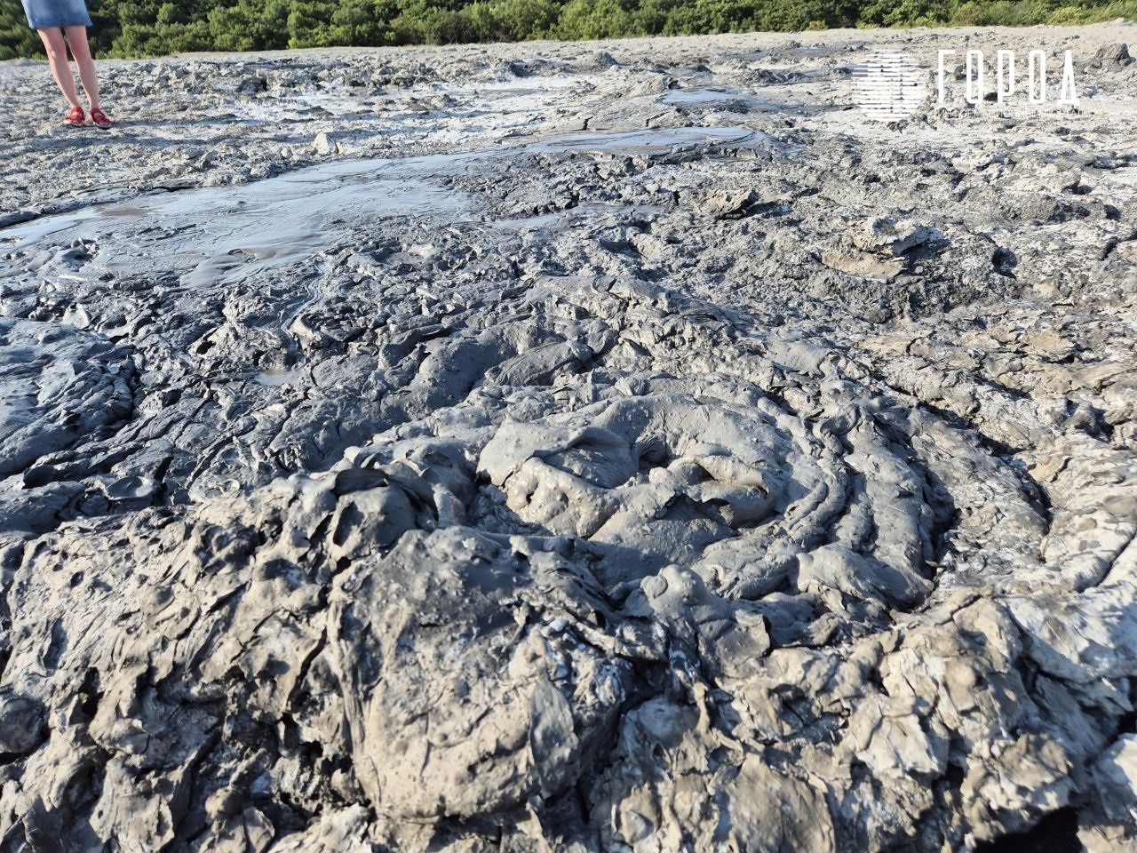 Лесная тропинка ведёт к самому вулкану. Выйдя по ней из леса, открывается картина этого необычного творения природы. Огромный кратер диаметром 450 метров сверху представляет собой застывшие выбросы вулкана. Эта «грязь», состоящая из воды, брома, йода и других веществ, которые издавна считают целебными. В чаше кратера бурлят несколько небольших вулканчиков. Из них вместе с тонкими струйками грязи вырывается в атмосферу метан. Зрелище увлекательное. Местами застывшая «лава» вулкана прогибается. Можно аккуратно попрыгать, как на батуте. Но везёт не всем. Один из подростков провалился, оказавшись по колено в грязи.