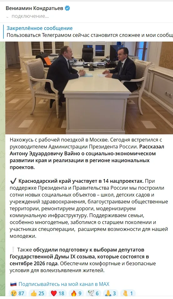 Пока гремели подробности уголовного дела и называлось происхождение многомиллиардных активов Андрея Коробки, Вениамин Кондратьев опубликовал фотографию встречи с руководителем администрации Президента РФ Антоном Вайно. Зачем-то Вениамин Иванович напомнил тому, что в Краснодарском крае как и по всей стране реализуются национальные проекты, и о грядущих в сентябре выборах Госдумы. Предполагаем, чтобы Антон Вайно не забыл о них. Никакой реакции со стороны администрации Президента РФ на аудиенцию с Вениамином Кондратьевым не было. На её сайте даже не найдёте упоминания о встрече.