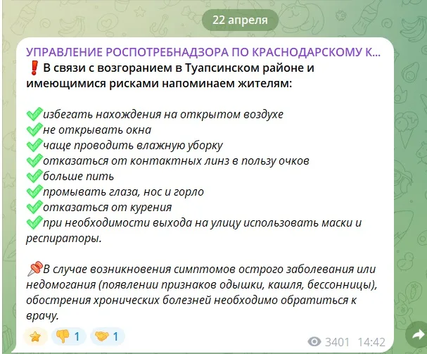 При этом в понедельник, сразу после атаки, Роспотребнадзор уже публиковал памятку для граждан. Но она была представлена как правила поведения рядом с очагом пожара («памятка для граждан в зоне возгорания»). Там тоже советовали не выходить на улицу и закрывать окна. Но о специфике «нефтяного дождя» и о мерах защиты от химического загрязнения речи не шло.