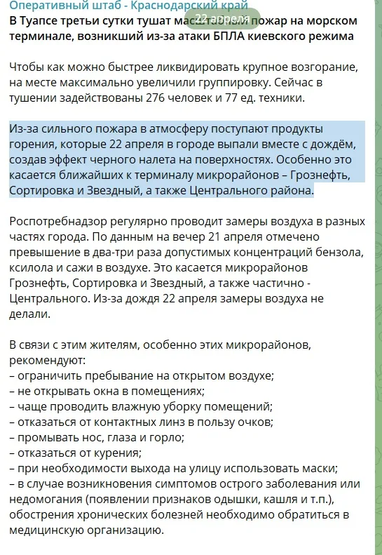 Пока власти молчали, жители Туапсе самостоятельно фиксировали ухудшение обстановки и требовали информации. Несмотря на запрет властей публиковать последствия атак БПЛА, местные соцсети и телеграм-каналы наполнялись тревожными сообщениями. Люди отмечали, что они вынуждены дышать токсичными веществами, которые образуются при сжигании нефтепродуктов. Особенно тяжело приходится аллергикам, они испытывают сильную одышку.