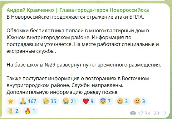 А в 23:12 мэр Новороссийска Андрей Кравченко сообщил, что «обломки беспилотника попали в многоквартирный дом в Южном внутригородском районе»: «Информация по пострадавшим уточняется. На месте работают специальные и экстренные службы. На базе школы №29 развернут пункт временного размещения. Также поступает информация о возгораниях в Восточном внутригородском районе. Службы направлены. Дополнительную информацию доведу позже».