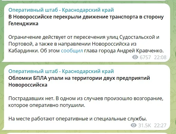 — Обломки БПЛА упали на территории двух предприятий Новороссийска. В одном из случаев произошло возгорание, которое оперативно потушили, — сообщал Оперштаб в 22:27. При этом столб дыма наблюдают в Новороссийске до сих пор.