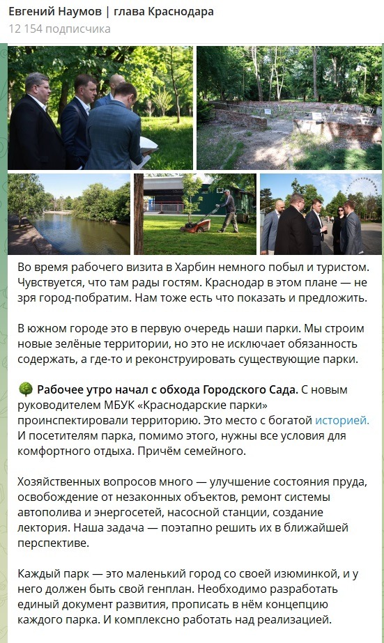 В мае 2024 года глава Краснодара Евгений Наумов, одухотворенный Поднебесной, вернулся из Китая в краевую столицу. Мэр с гордостью отметил, что в Краснодаре тоже есть что показать туристам. И привёл в пример Городской сад Краснодара, который и посетил. Это старейший парк города, заложенный ещё в 1836 году. Евгений Наумов пообещал разработать для первого, появившегося ещё в Екатеринодаре сада, Генеральный план.