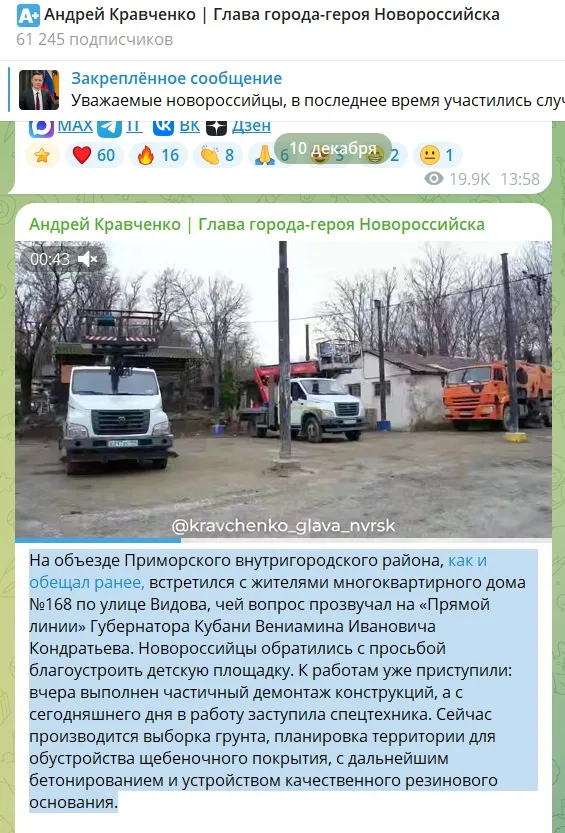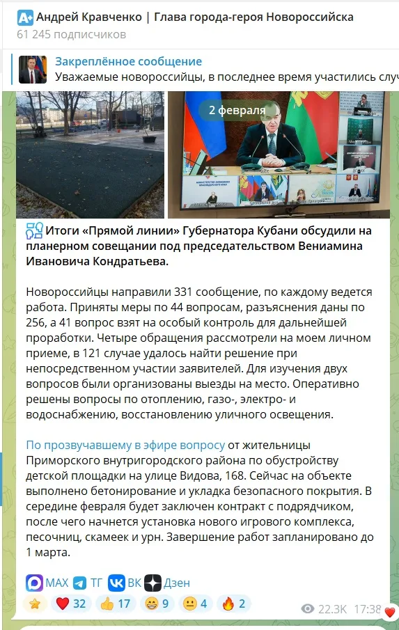 К 9 марта в Новороссийске Краснодарского края глава города-героя Андрей Кравченко обманул губернатора на прямой линии и жителей о завершении строительства детской площадки на улице Видова.