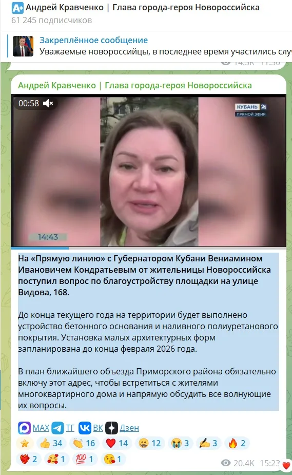 Губернатор Краснодарского края 5 декабря 2025 года провёл традиционную прямую линию. Со своими проблемами и бедами к главе региона обращались жители со всего региона. Поступил звонок и от жительницы Новороссийска Виктории Владимировны Ведмовой.