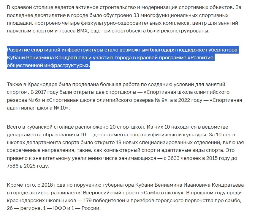 Накануне вышла пиар-статья об успехах спорта Краснодара за последние 10 лет. «Развитие спортивной инфраструктуры стало возможным благодаря поддержке губернатора Кубани Вениамина Кондратьева и участию города в краевой программе «Развитие общественной инфраструктуры», — основной посыл публикации. — «Кроме того, с 2018 года по поручению губернатора Кубани Вениамина Ивановича Кондратьева в городе активно развивается Всероссийский проект «Самбо в школу». Главное, чтобы благодарные краснодарцы знали, что обязаны развитым спортом именно губернатору, а не налоговым отчислениям, росту экономики и другим неважным причинам. Не Владимиру Путину, каким-то федеральным организациям, а именно Вениамину Ивановичу.