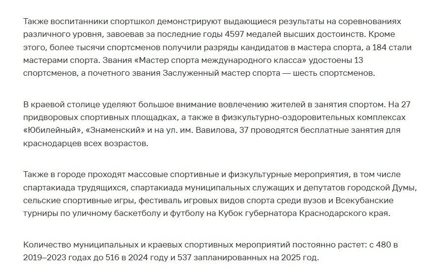 Но больше всего удивил подход к оценке качества занятий в спортивных школах. В администрации Краснодара отчитались, что в 2019-2023 годы проводилось ежегодно по 480 городских и краевых спортивных мероприятий. А в 2024-м – целых 537. Отметим, что подавляющее количество спортивных мероприятий проводит не мэрия, а спортивные федерации. Причём часто на взносы самих спортсменов и средства федераций, которые ищут эти самые средства у спонсоров.