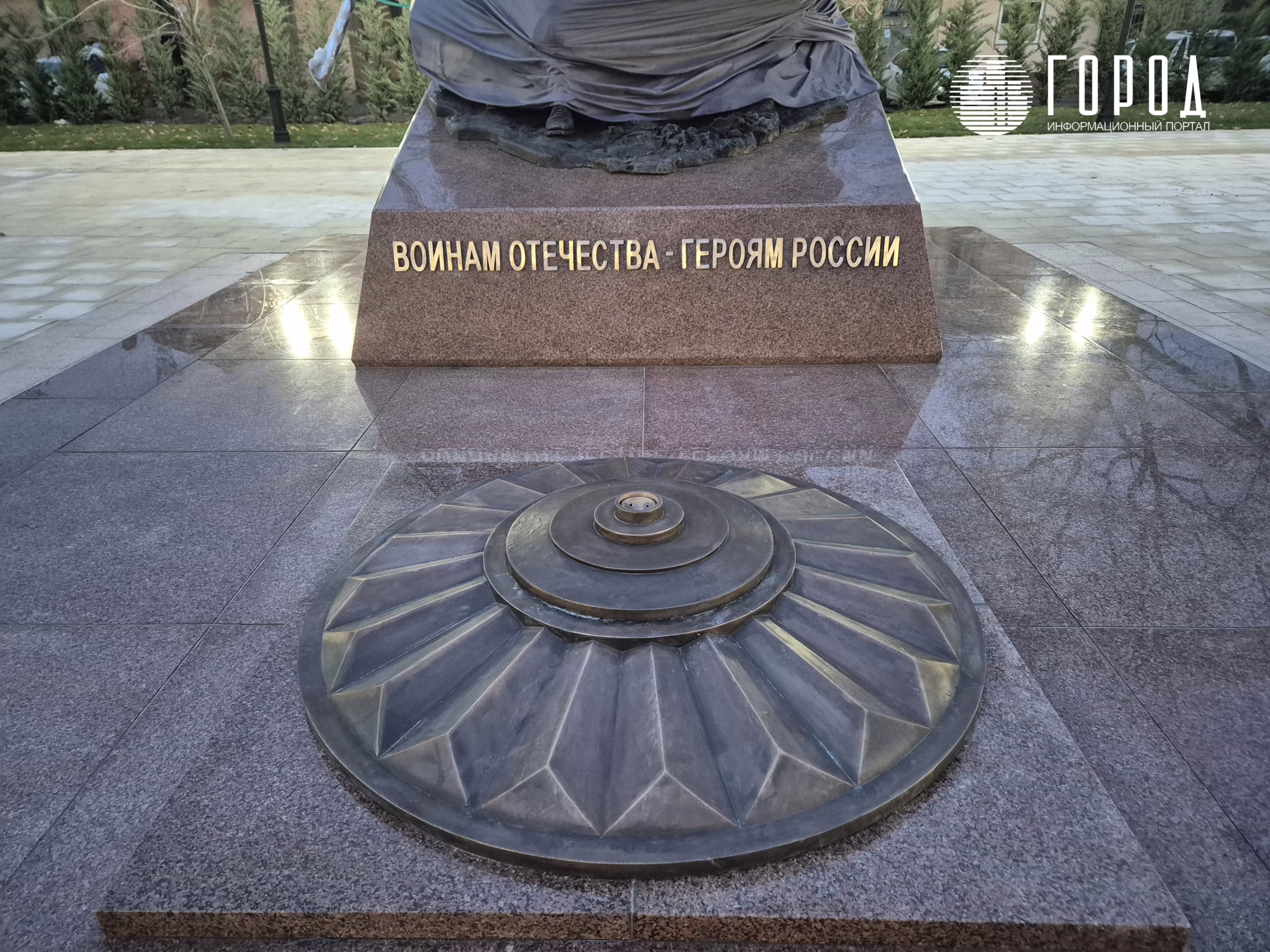 В глубине огромной площади из плитки возвышается десятиметровый памятник. На гранитной плите бронзовое место для Вечного огня, который зажгут послезавтра. Его сделали не в привычном для многих поколений стиле – в форме пятиконечной звезды, а круглым. Со стороны напоминает щит времён античности. Многочисленные выступающие грани только подчёркивают имперский стиль.