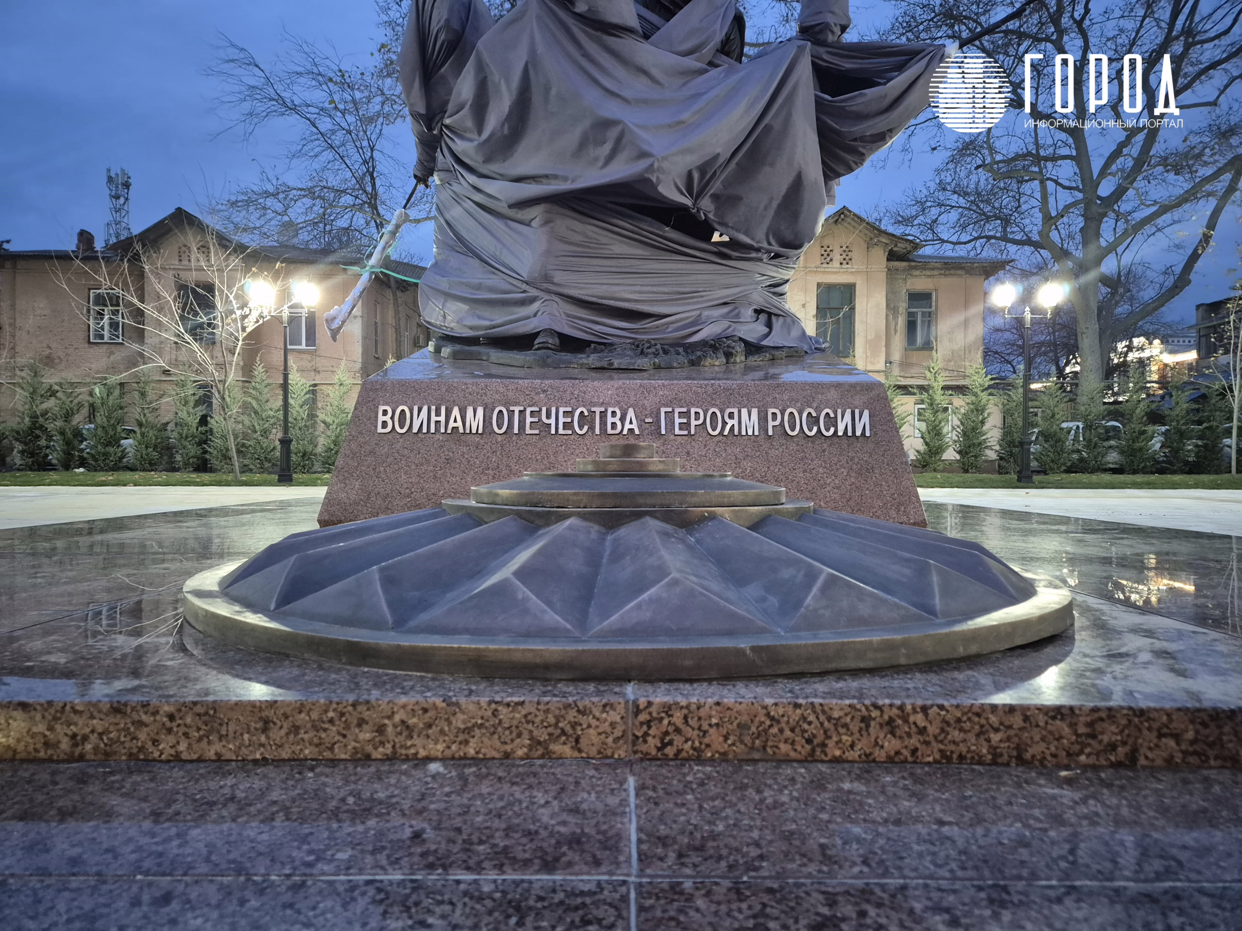 Бронзовые скульптуры сделали в полный рост – около 180 сантиметров каждая. Ветер воскресным вечером сорвал часть полотнища, скрывающего памятник. И до официального открытия прохожим виден лик воина-освободителя. На гранитном постаменте под скульптурой выбиты слова: «Воинам Отечества – Героям России».