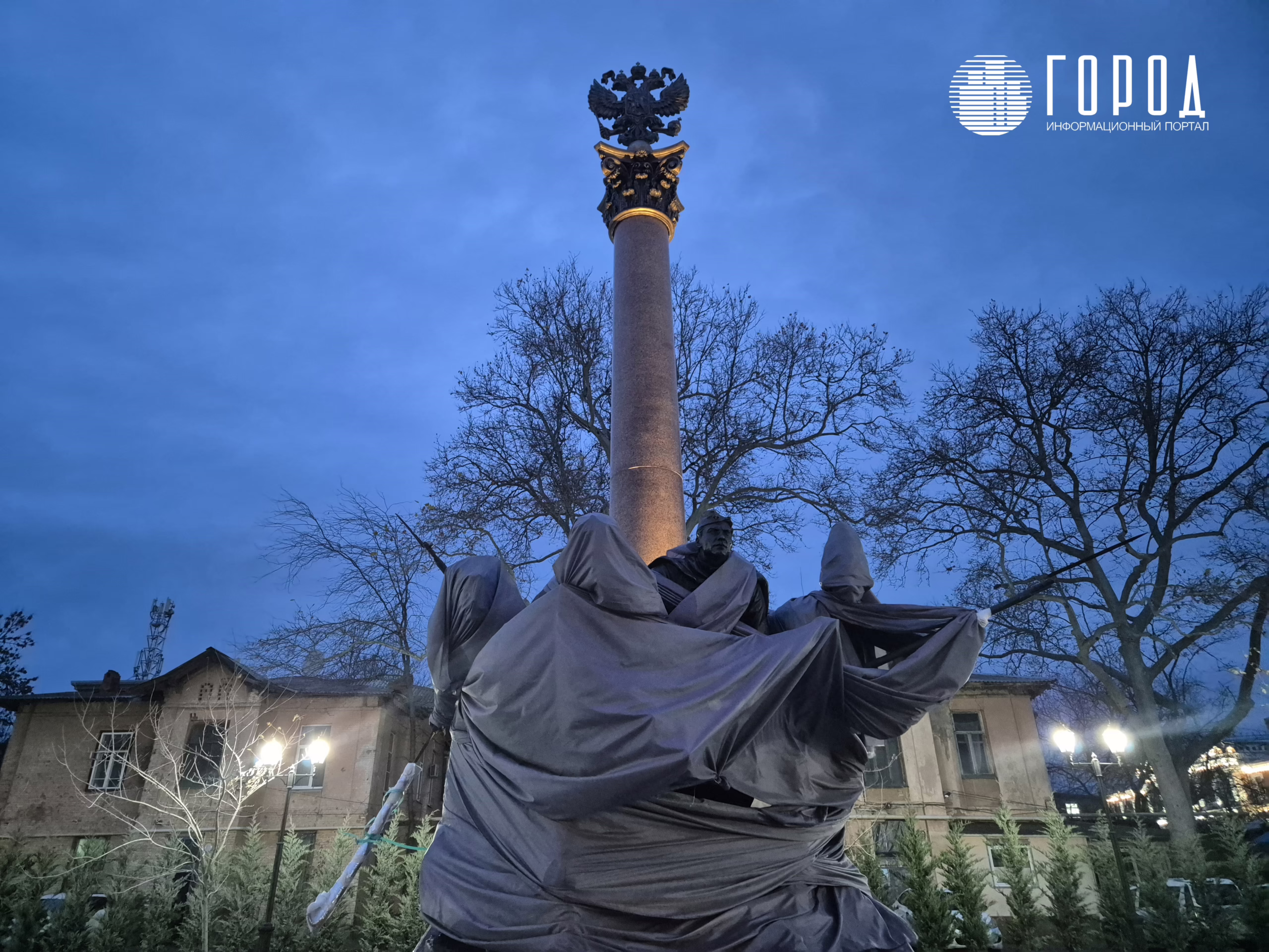 «Защищают» воины Отечества высокую гранитную колонну, которую совсем недавно собирали по частям (фоторепортаж). На вершине бронзовая коринфская капитель – классический архитектурный ордер Древней Греции и Рима. Она держит на себе государственный бронзовый герб – двуглавого орла. К неоткрытому официально памятнику со скрываемыми пока фигурами воинов уже идут краснодарцы. Несмотря на сильный ветер, от которого в сквере по воле мэрии укрыться оказалось негде. Пока не появилось и таблички об авторах и смыслового описания памятника. Об истории создания сквера Героев Отечества, и как его лишили обещанных деревьев – читайте в специальном материале krd.gorod.space.