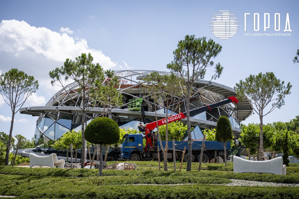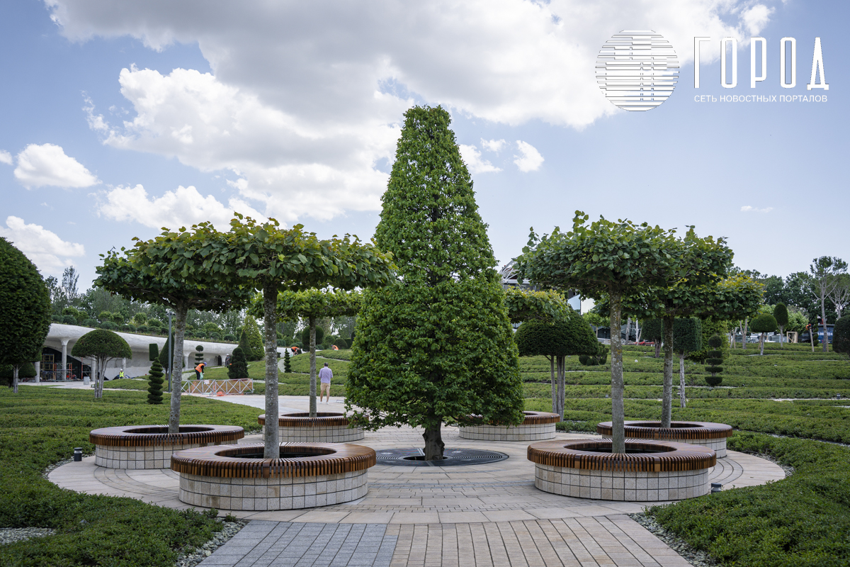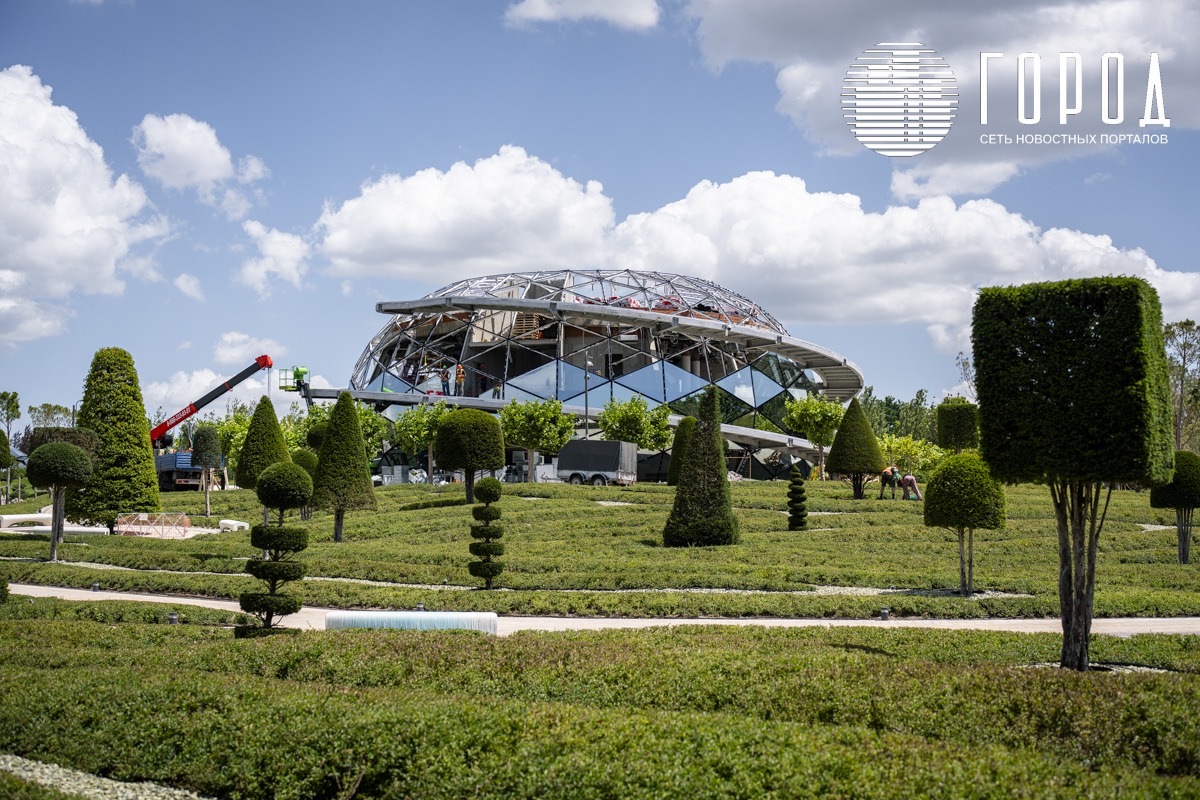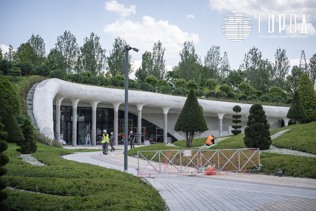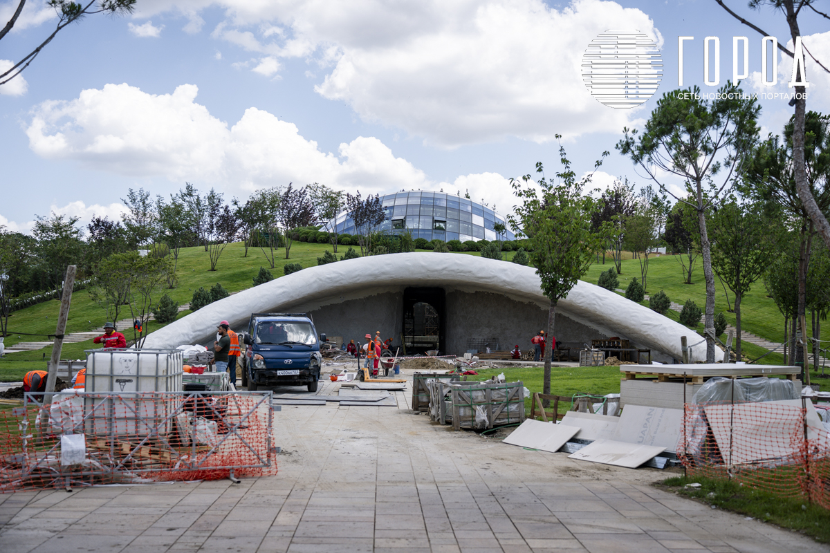 Внимание посетителей парка Облаков привлекает строительство большого павильона в центре объекта. Здесь вовсю даже на жаре кипит работа. Внутри рабочие монтируют электрическое оборудование. Устанавливают кондиционеры, делают вытяжки. Заметны в фокус фотокамеры какие-то поддоны. Часть рабочих занимаются креплением стеклянного панно павильона. Рядом с ним стоит вышка. А вокруг идёт озеленение территории. Одни сотрудники подстригают газон, а другие заботливо подвязывают к колышкам хвойные и другие деревья.