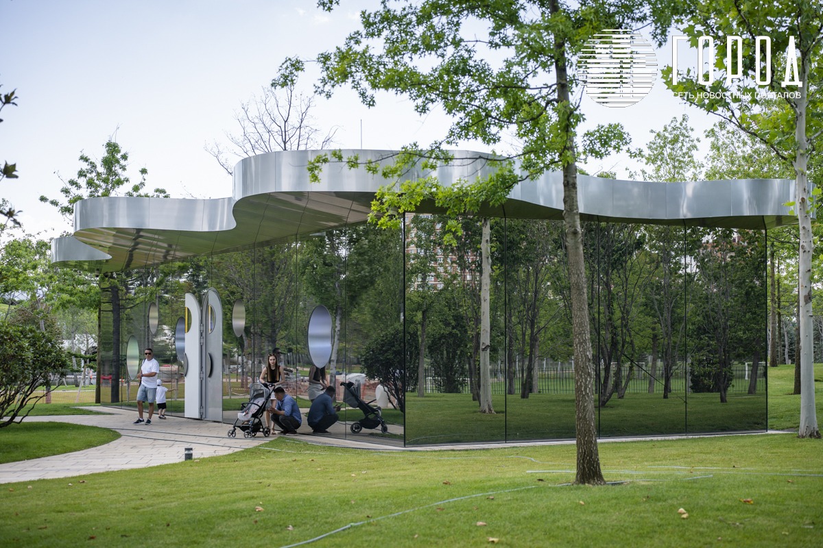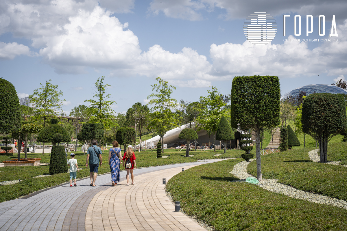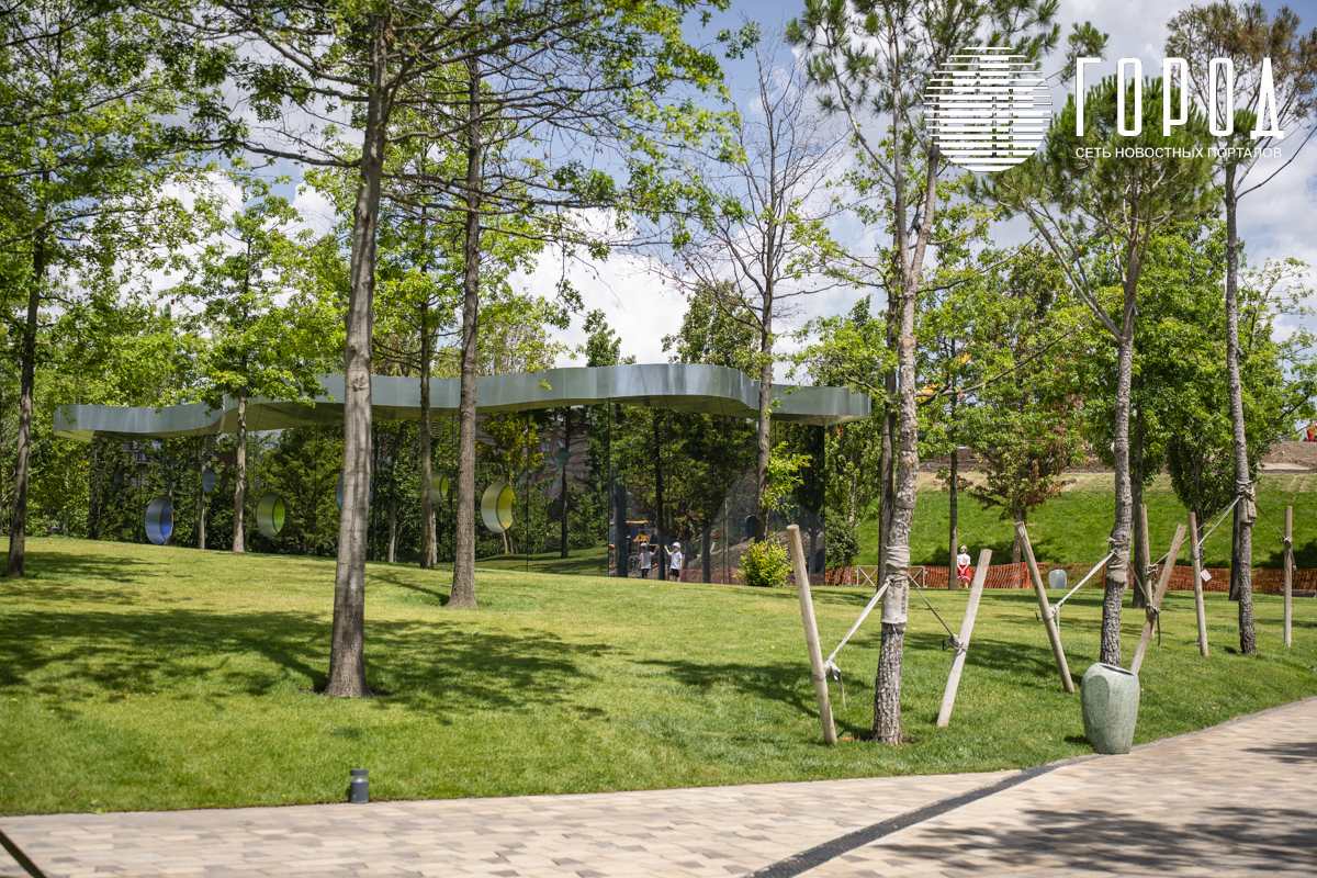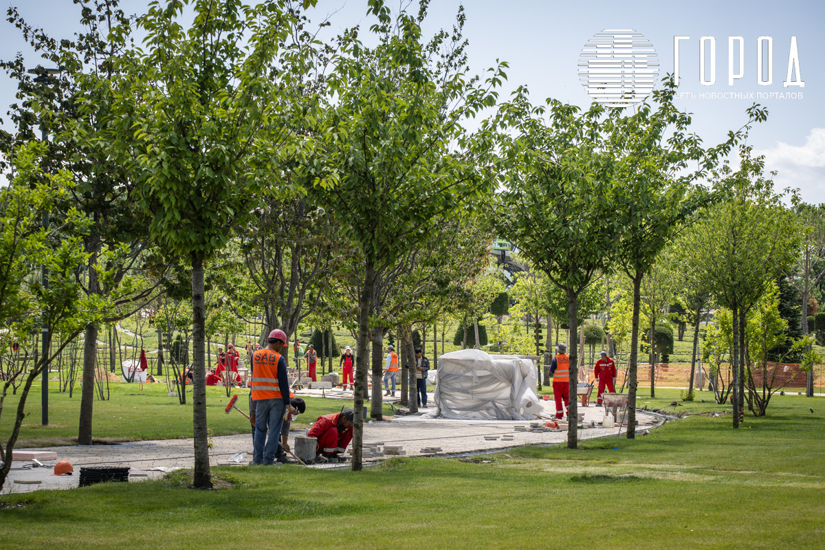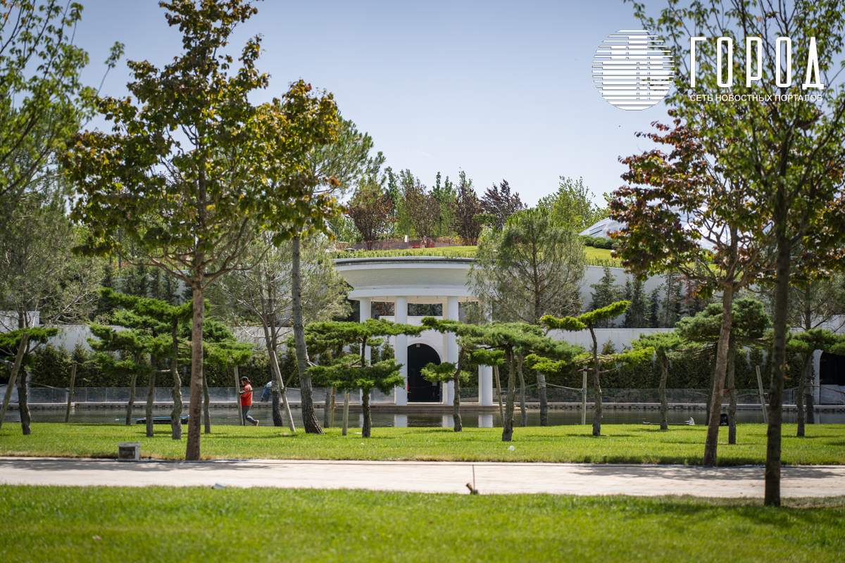 Внимание посетителей парка Облаков привлекает строительство большого павильона в центре объекта. Здесь вовсю даже на жаре кипит работа. Внутри рабочие монтируют электрическое оборудование. Устанавливают кондиционеры, делают вытяжки. Заметны в фокус фотокамеры какие-то поддоны. Часть рабочих занимаются креплением стеклянного панно павильона. Рядом с ним стоит вышка. А вокруг идёт озеленение территории. Одни сотрудники подстригают газон, а другие заботливо подвязывают к колышкам хвойные и другие деревья.