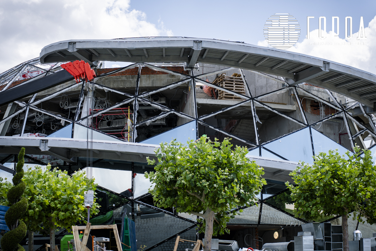 На входе в павильон сделали необычную арку. Тут же строители укладывают плитку. Слышны громкие звуки работы болгарки и перфоратора. Где-то вне видимости для глаз посетителей режут плитку и листы для создания панно. Под аркой открывается проход в туннель. И удивительно – внутри виден естественный свет. По всей видимости, лучи солнца проходят через монтируемый купол, создавая внутри натуральное освещение. По словам одного из рабочих, в туннеле делают подземную оранжерею. В итоге должно быть очень красиво. Таких подземных галерей две. У одной из них много строителей. Колонны готовят к штукатурке. Рабочие выводят плавные линии. Ведётся отсыпка и облагораживание прилегающей территории.