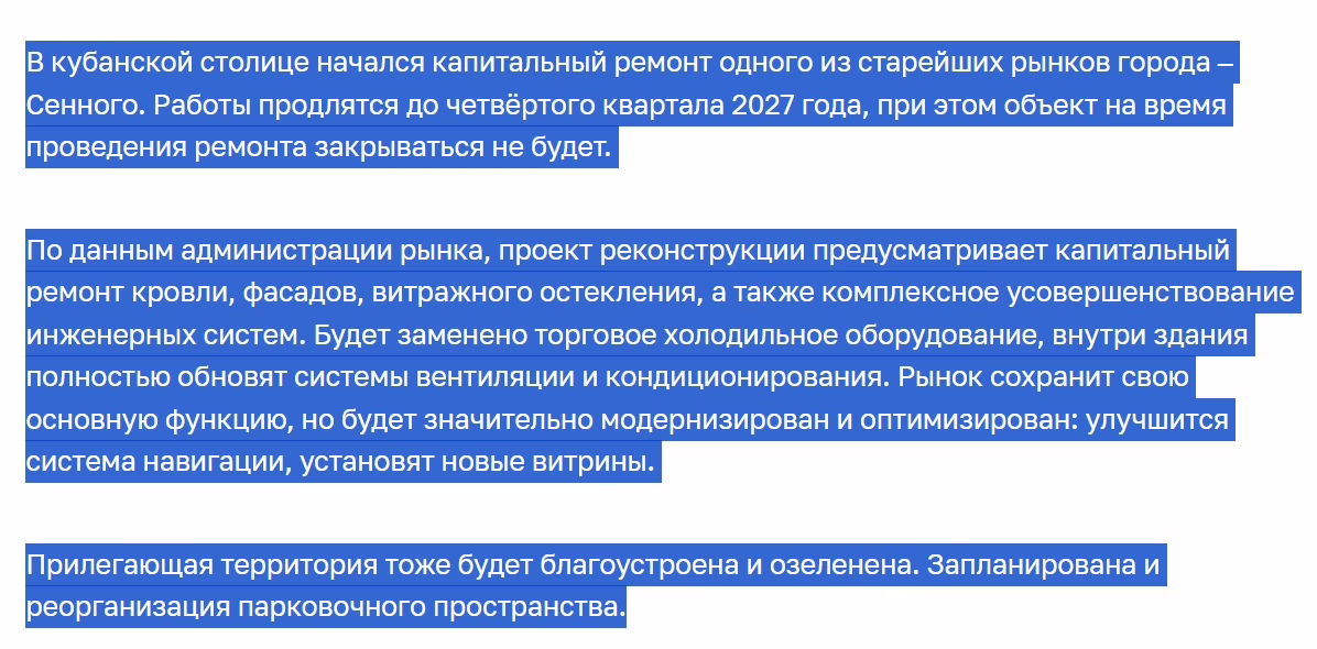 Слухи о том, что Сенной рынок Краснодара купил застройщик, появились ещё в середине лета. Кстати, тогда же «ожили» страницы рынка в социальных сетях. До этого их никто не вёл с 2022 года. Сейчас в пабликах рынка постоянно проводят различные розыгрыши. Призы – продукция рынка. Например, килограмм подорожавшей хамсы или отборной слабосолёной селёдочки «первой свежести», как писал Михаил Булгаков.