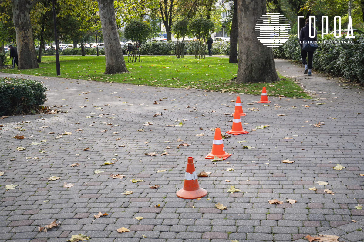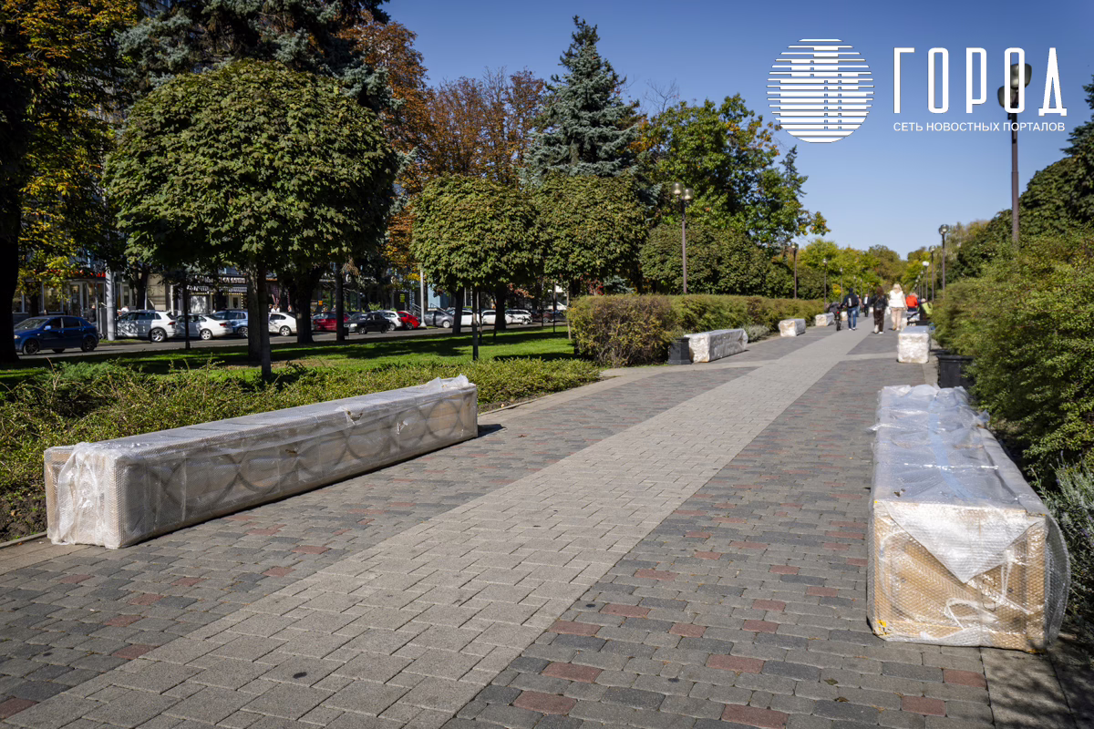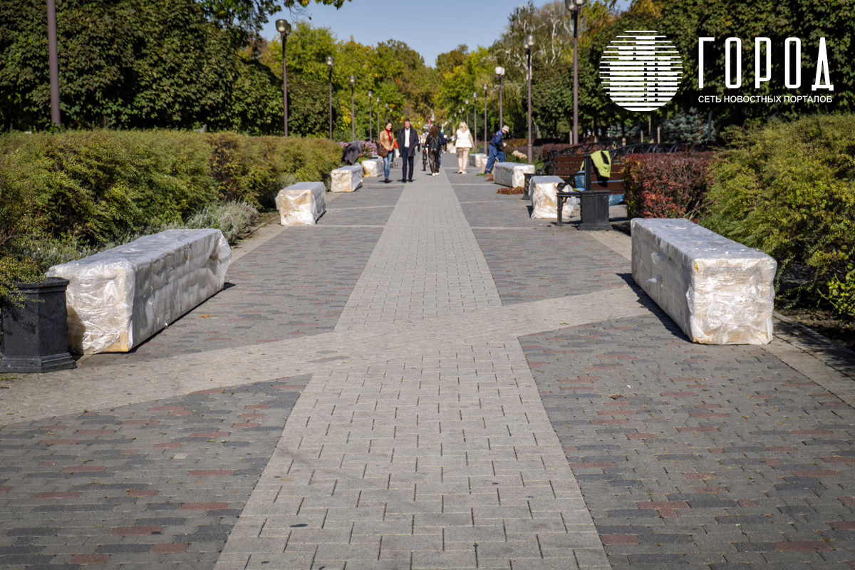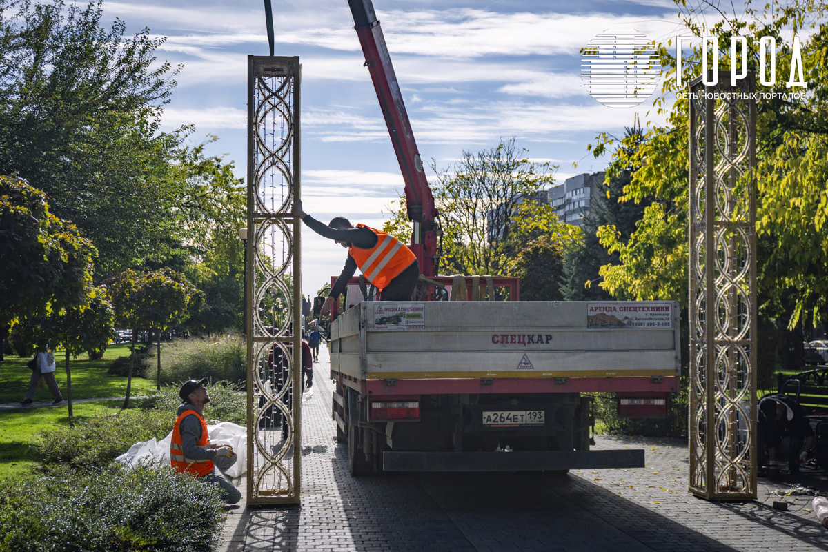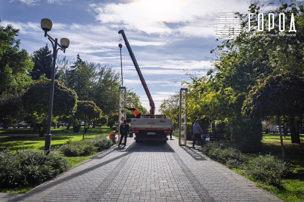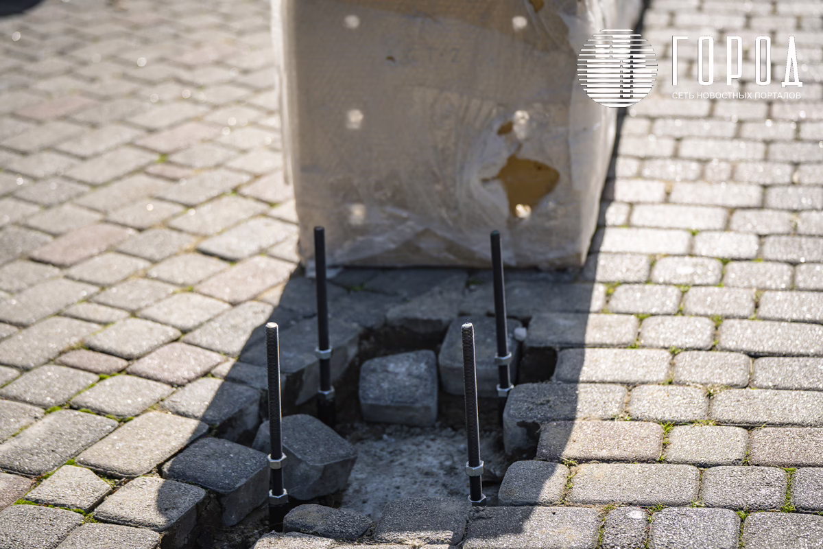 Работы начались, как и в прошлом году, с участка Александровского бульвара от улицы Одесской до Гаврилова. Рабочие завезли колонны, которые совсем скоро превратятся в яркие светящиеся арки. Под их установку заботливо убрали с бульвара часть плитки для надёжного монтажа шарниров. Местами из земли торчат железные штыри, призванные укрепить конструкции.