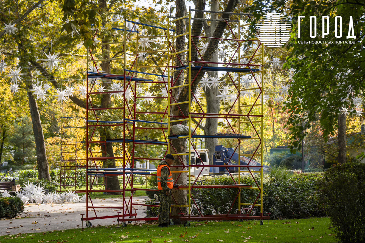 Их сейчас активно вбивают у «Царских ворот» — Александровской триумфальной арки. Сюда же рабочие завозят колонны, из которых сделают в итоге настоящую аллею. Здесь же выгружают инструменты. Пригнали несколько вышек. Их примерно шесть-семь. С их помощью через Александровский бульвар натягивают гирлянды из огромных звёздочек-снежинок. Прокладывают и провода электросетей для последующего подключения многочисленных объектов.