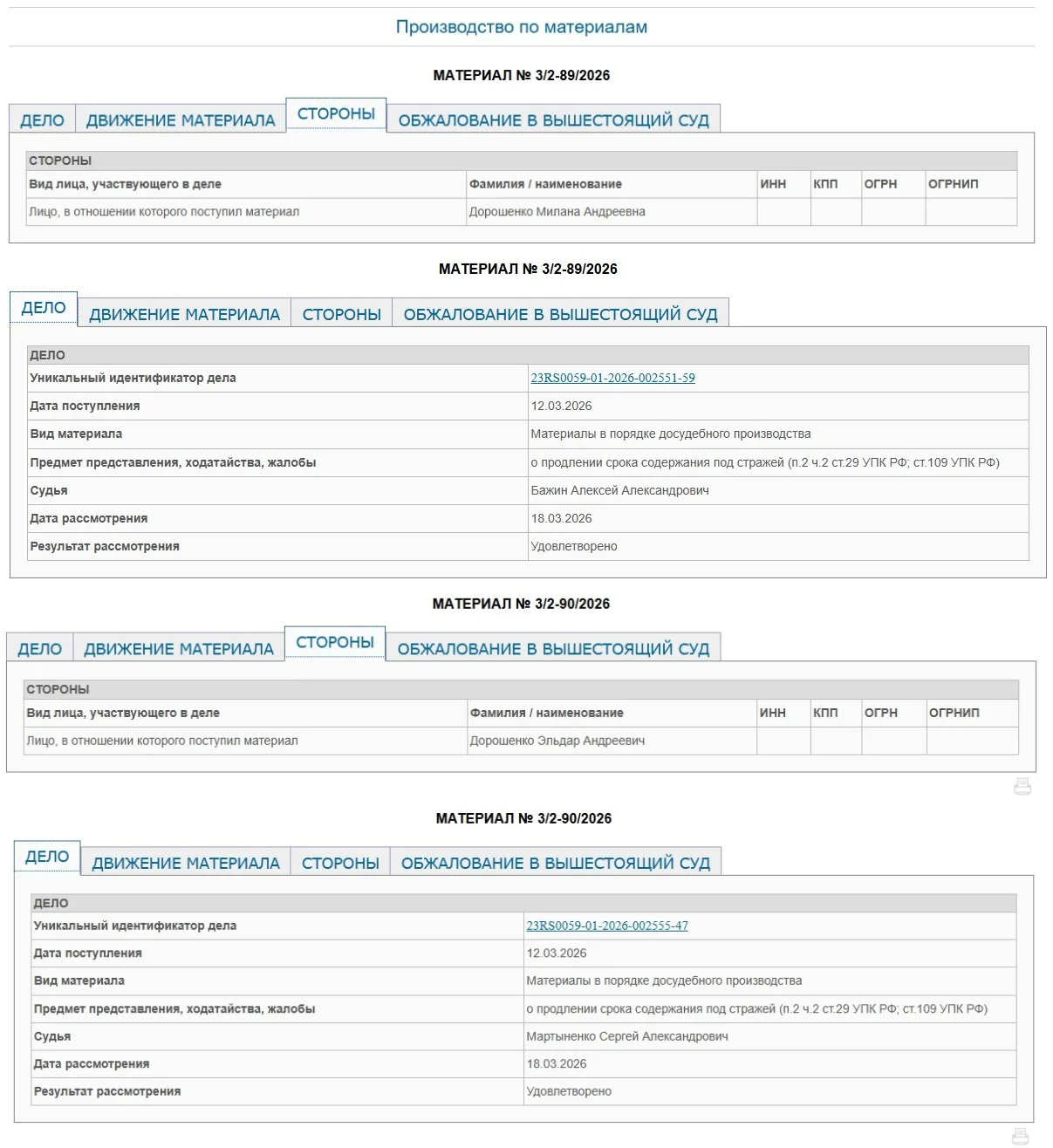 Ходатайства по мере пресечения подало следствие в связи с истечением предыдущих сроков. Они были установлены при первоначальном заключении под стражу в конце января 2026 года. Судьи, рассмотрев материалы дела и доводы органов предварительного следствия, сочли необходимым оставить обвиняемых под стражей. В свою очередь защита Миланы и Эльдара Дорошенко не согласилась с решением суда первой инстанции. Дети депутата к настоящему времени подали апелляционные жалобы на решения о продлении ареста. Их Краснодарский краевой суд пока не рассматривал.