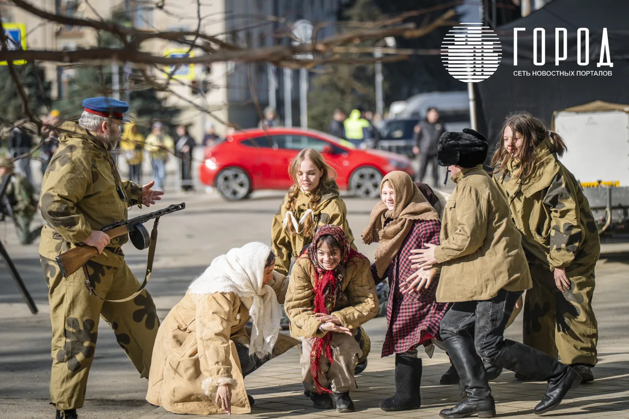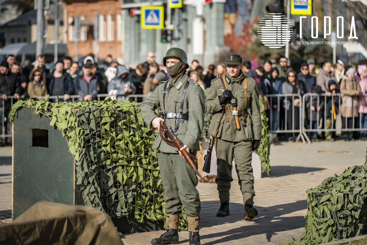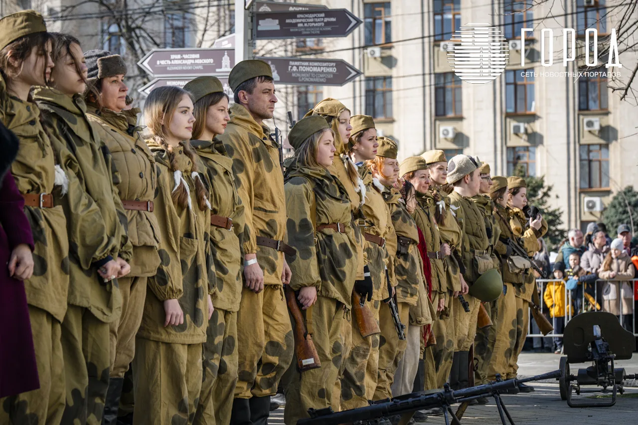 В рамках празднования годовщины освобождения Краснодара от оккупантов у Вечного огня и воинских памятников не выставили почётный караул и Пост №1, а напротив краевой администрации провели реконструкцию исторических событий.
