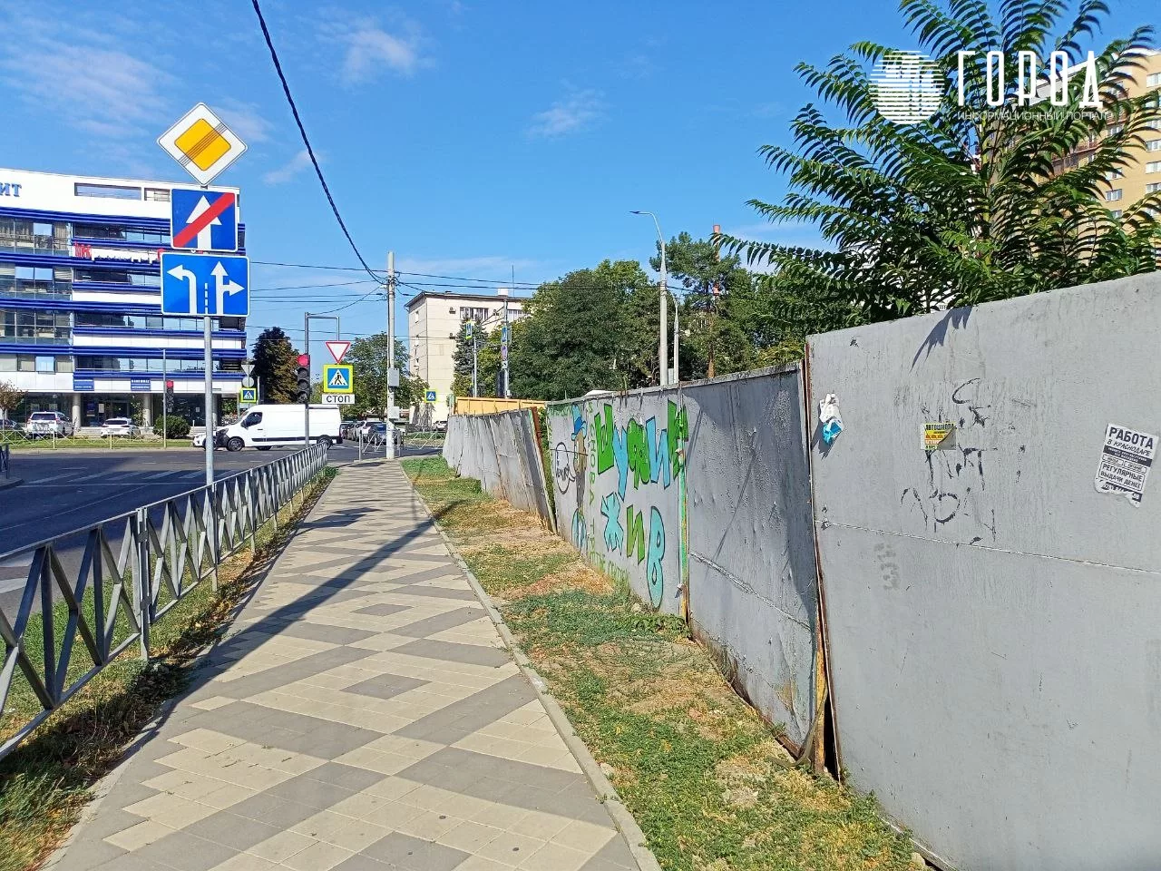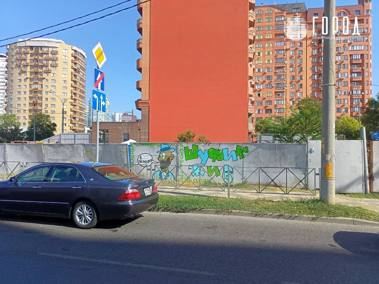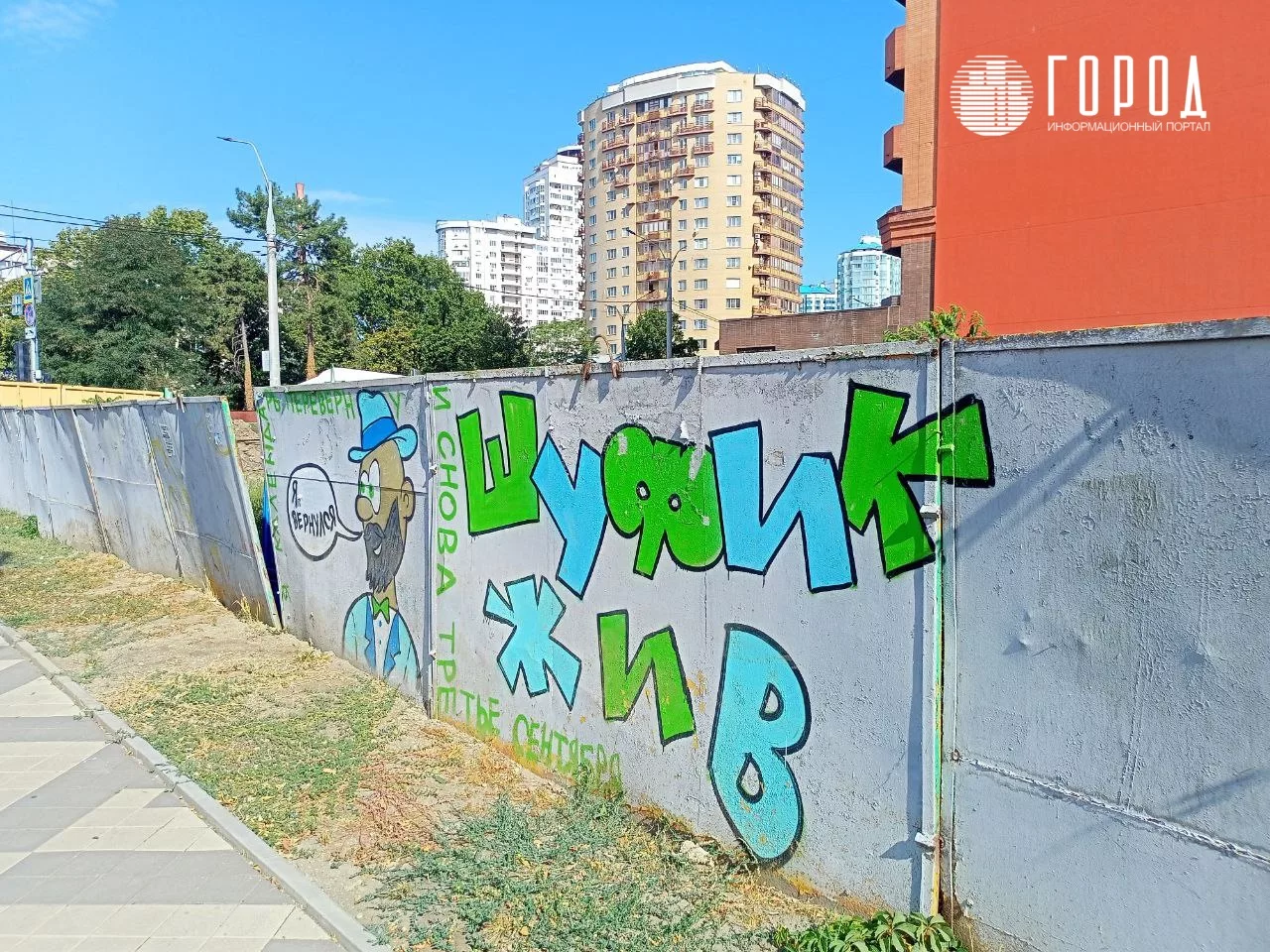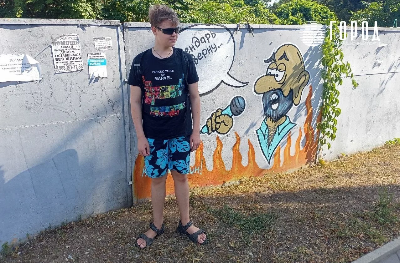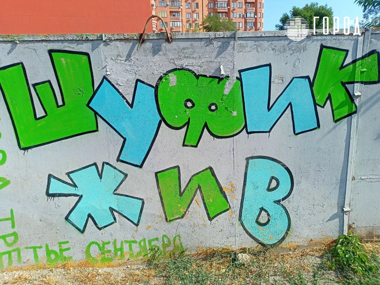 Но к 3 сентября 2022 года она уже пользовалась популярностью. На её фоне 3 сентября делали селфи краснодарцы. Место для граффити выбрали на длинном сером заборе вдоль недостроенного ЖК «Кларисса» со стороны улицы Советской. Точный адрес – Советская, 7. Стена находится практически на пересечении Советской и Кубанской набережной.