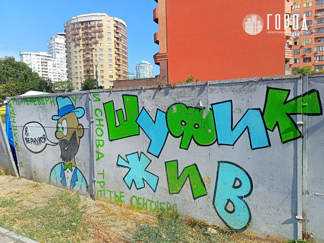 Зелёную рубашку сменил на белую, облачился в красивый голубой костюм с зелёной бабочкой, а на голове появилась шляпа. На одной створке забора красовался сам Михаил Захарович, гордо заявлявший: «Я вернулся». А рядом художники написали: «Шуфик жив».