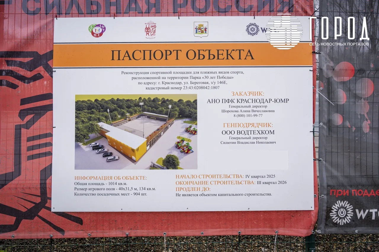 Согласно паспорту объекта, заказчиком выступает АНО ПФК «Краснодар-ЮМР». Возвести стадион пляжных видов спорта планируют до конца третьего квартала 2026 года. Причём он по документам не будет относиться к объектам капитального строительства. А само возведение площадки официально называется «реконструкцией спортивной площадки для пляжных видов спорта».
