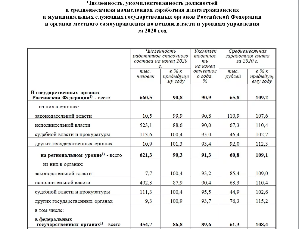 Численность гражданских и муниципальных служащих государственных органов Российской Федерации и органов местного самоуправления на 2020 год составляла 660,5 тысячи человек. После заявлений правительства о сокращении количества чиновников их число выросло на 9,4 тысячи человек, или на 1,5%. В федеральных госорганах работали 454,7 тыс. государственных служащих.