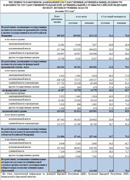 На муниципальном уровне, с учётом избирательных комиссий, насчитывалось 309 171 служащих. Из всех 669 918 служащих страны 76,6% — женщины, 23,4% — мужчины. То есть без работы после планируемых сокращений останутся в основном представительницы прекрасного пола, на чьих плечах и держится вся российская бюрократия.