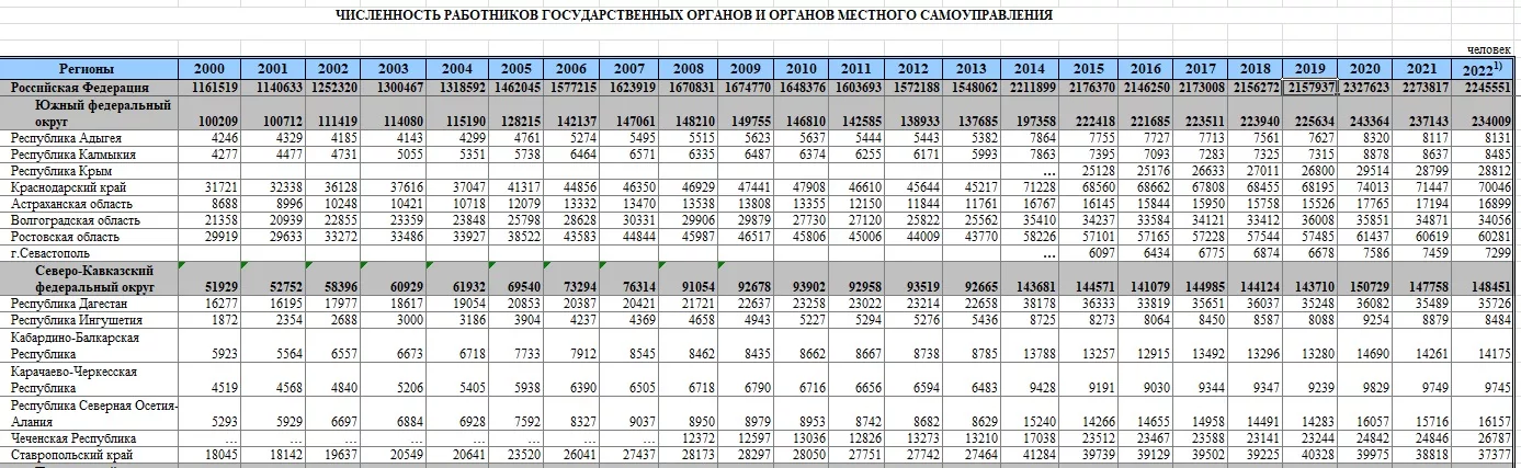 По данным Росстата, с 2000-го до 2022 года, пока как раз активно развивались интернет, цифровизация и робототехника, российская бюрократия удвоилась. С 1 161 519 человек в 2000 году, до 2 245 551 – в 2022 году.