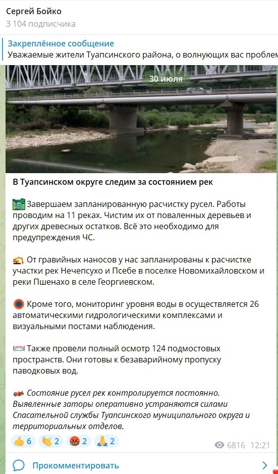 Глава Туапсе Сергей Бойко в конце июля отчитался о завершении расчистки русел рек на территории вверенного ему муниципалитета. Он подробно рассказывал об убранных деревьях, а также о расчистке 124 подмостовых пространств. Плюс говорилось об эффективном постоянном мониторинге уровня вод в реках.