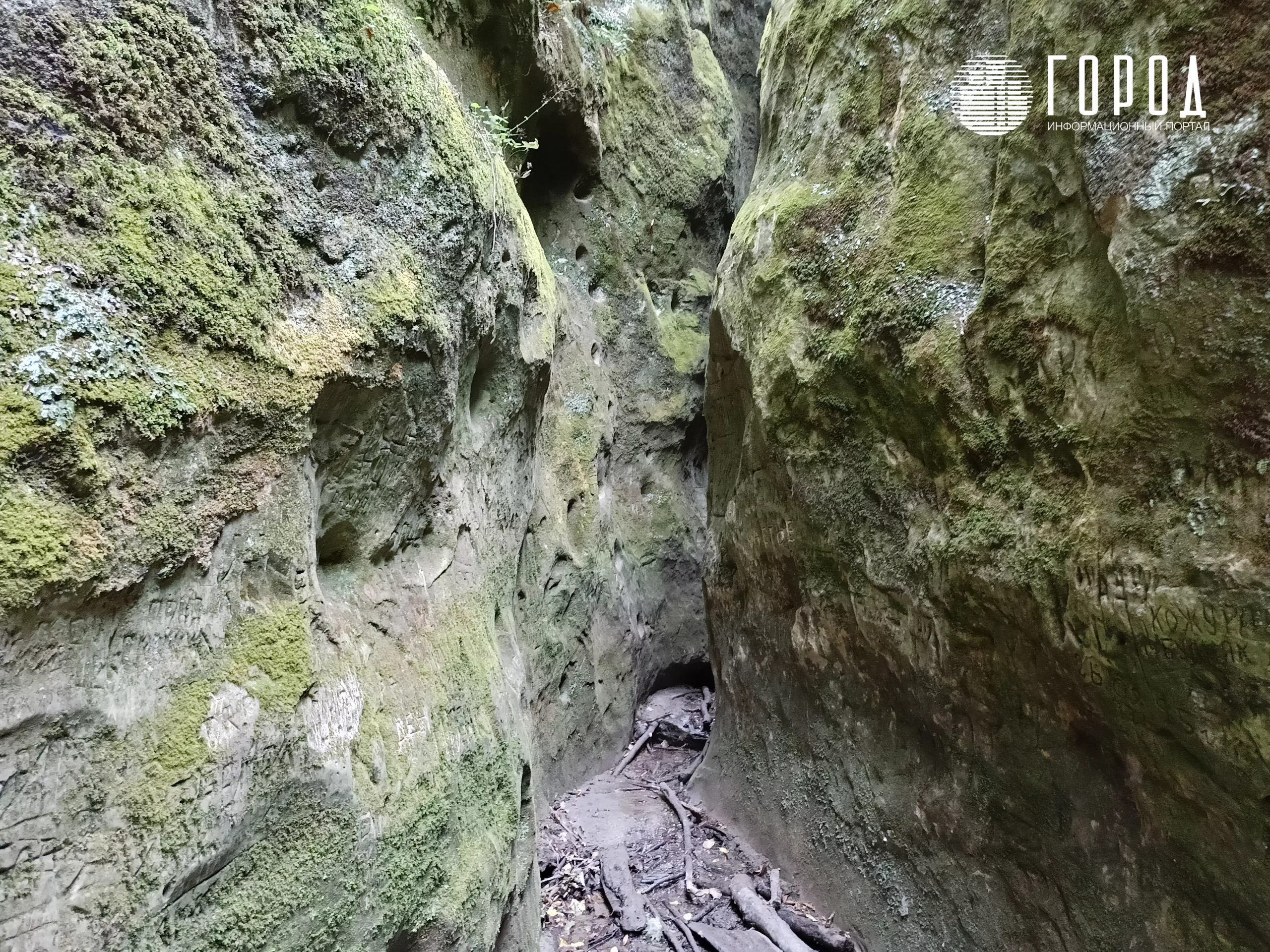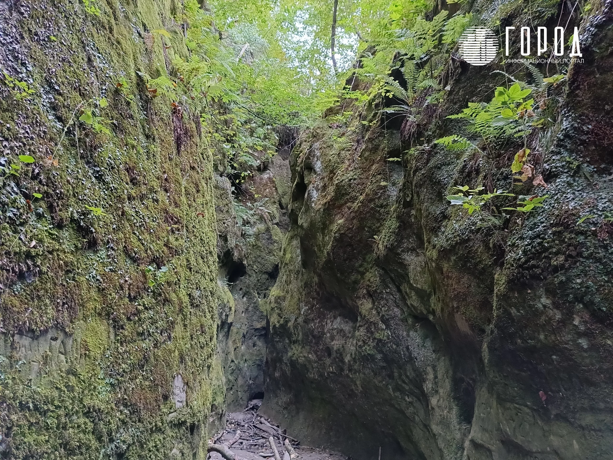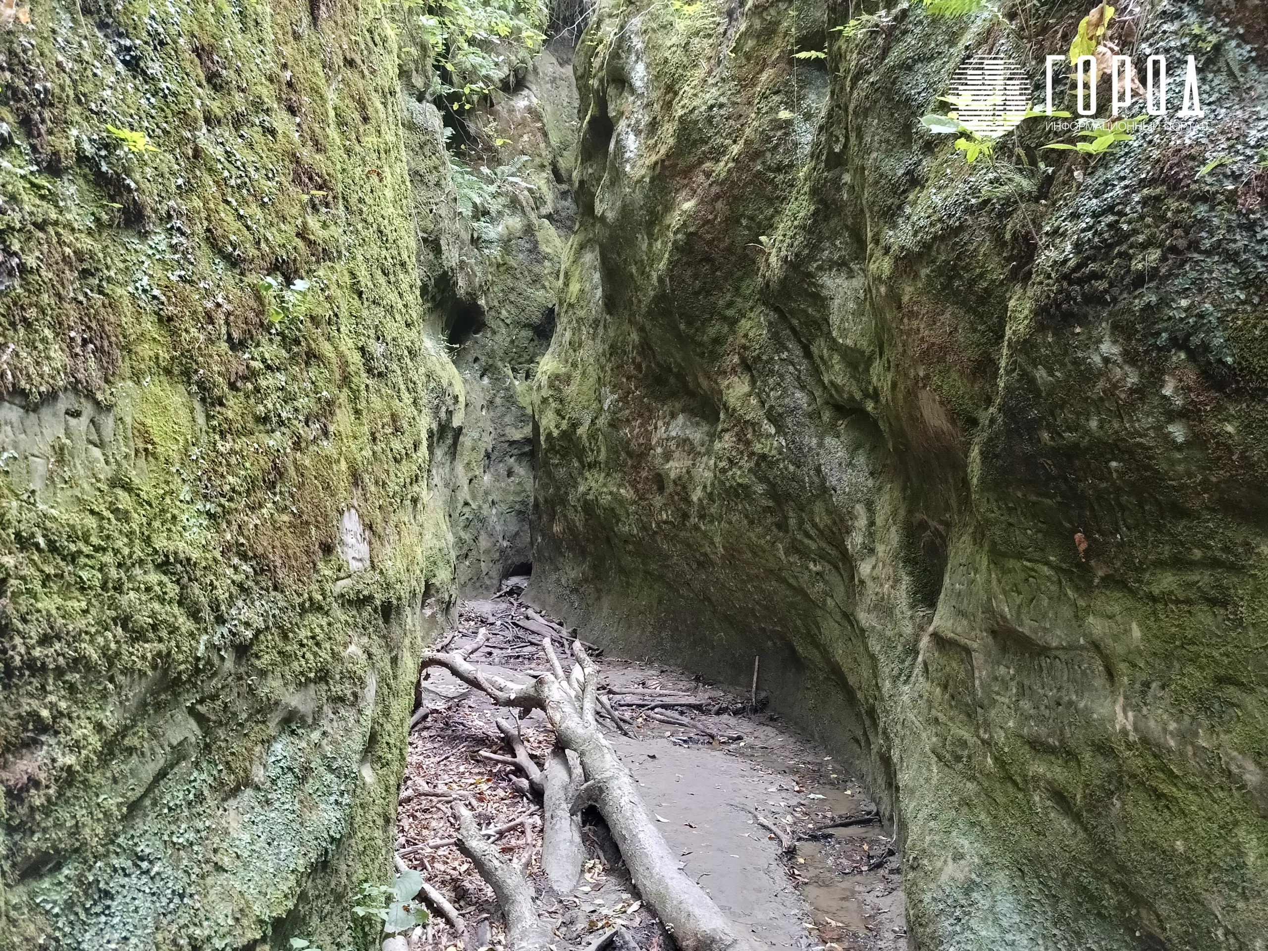 А рядом вход в узкое ущелье, которое тянется на 30-40 метров. Заходя в «коридор» сразу ощущаются эхо и звуки воды. Пройти полностью Волчьи ворота не получится. На другом конце начинается подъём, который завален пнями, ветками и деревьями. Через них и сочится вода.