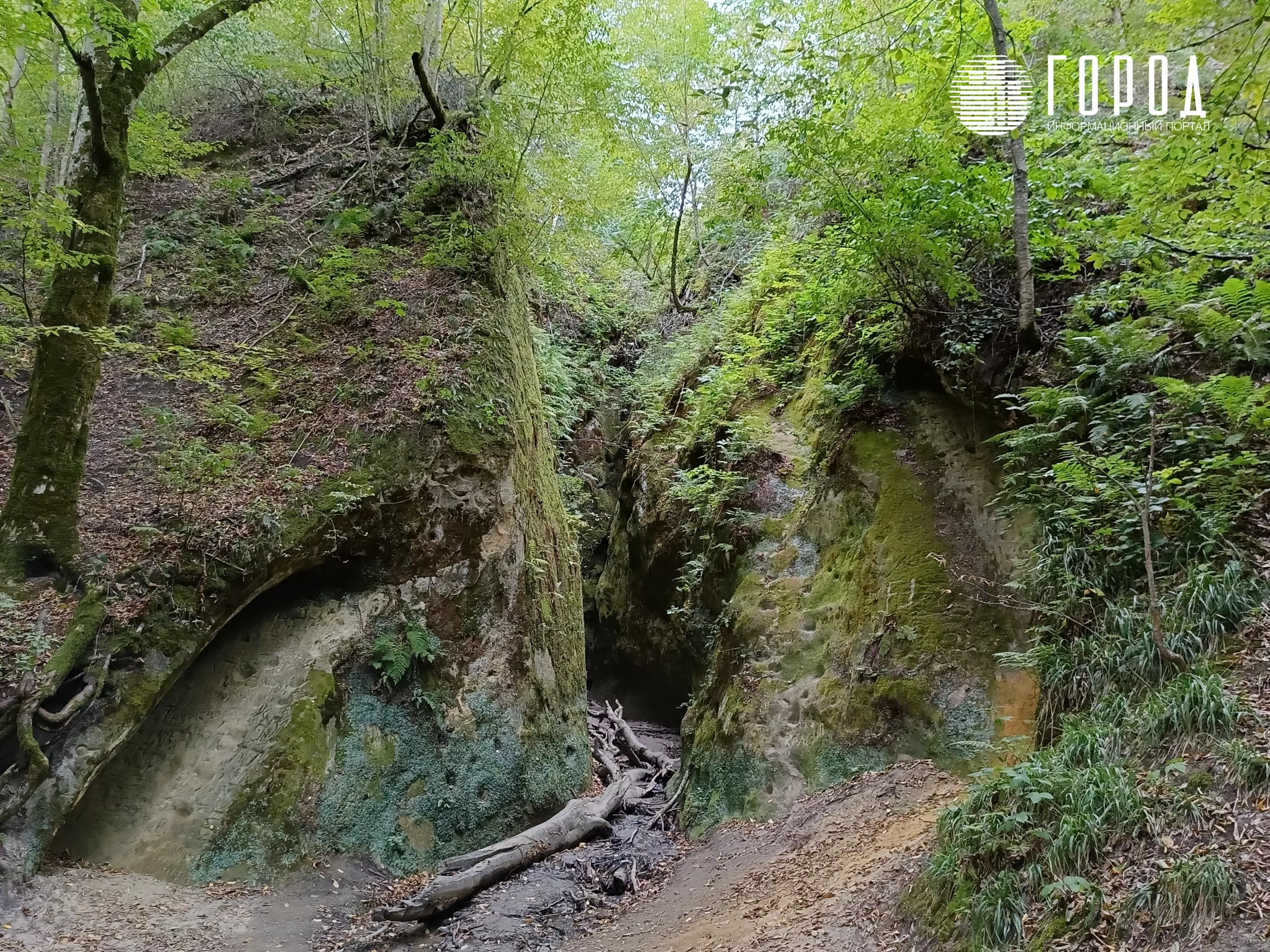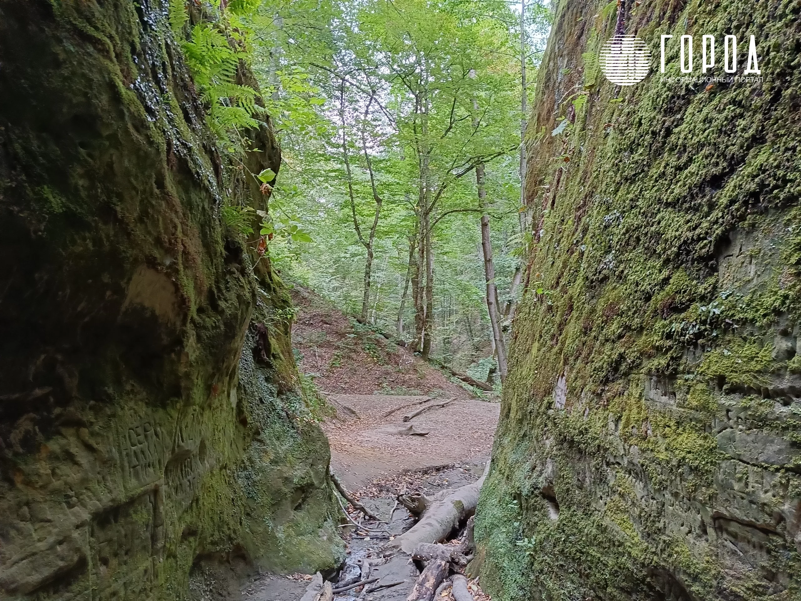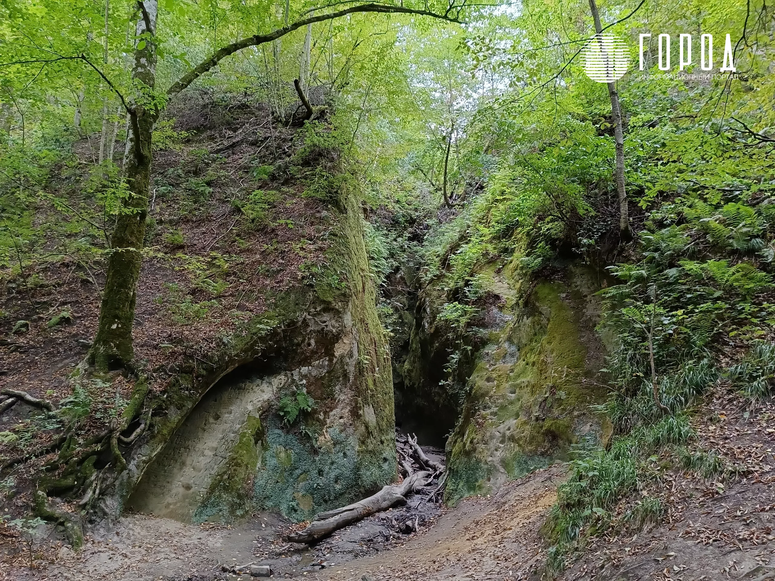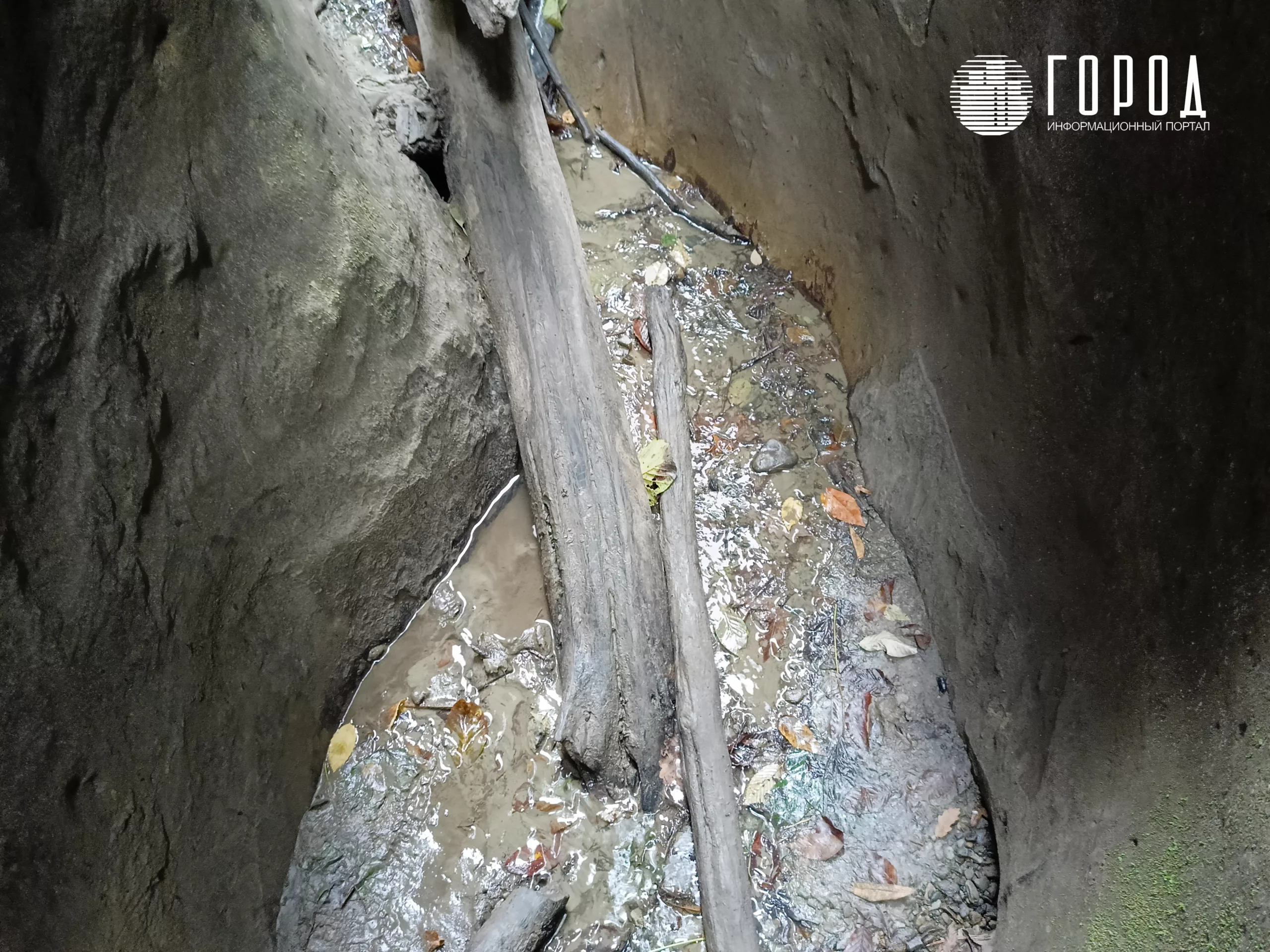 А рядом вход в узкое ущелье, которое тянется на 30-40 метров. Заходя в «коридор» сразу ощущаются эхо и звуки воды. Пройти полностью Волчьи ворота не получится. На другом конце начинается подъём, который завален пнями, ветками и деревьями. Через них и сочится вода.