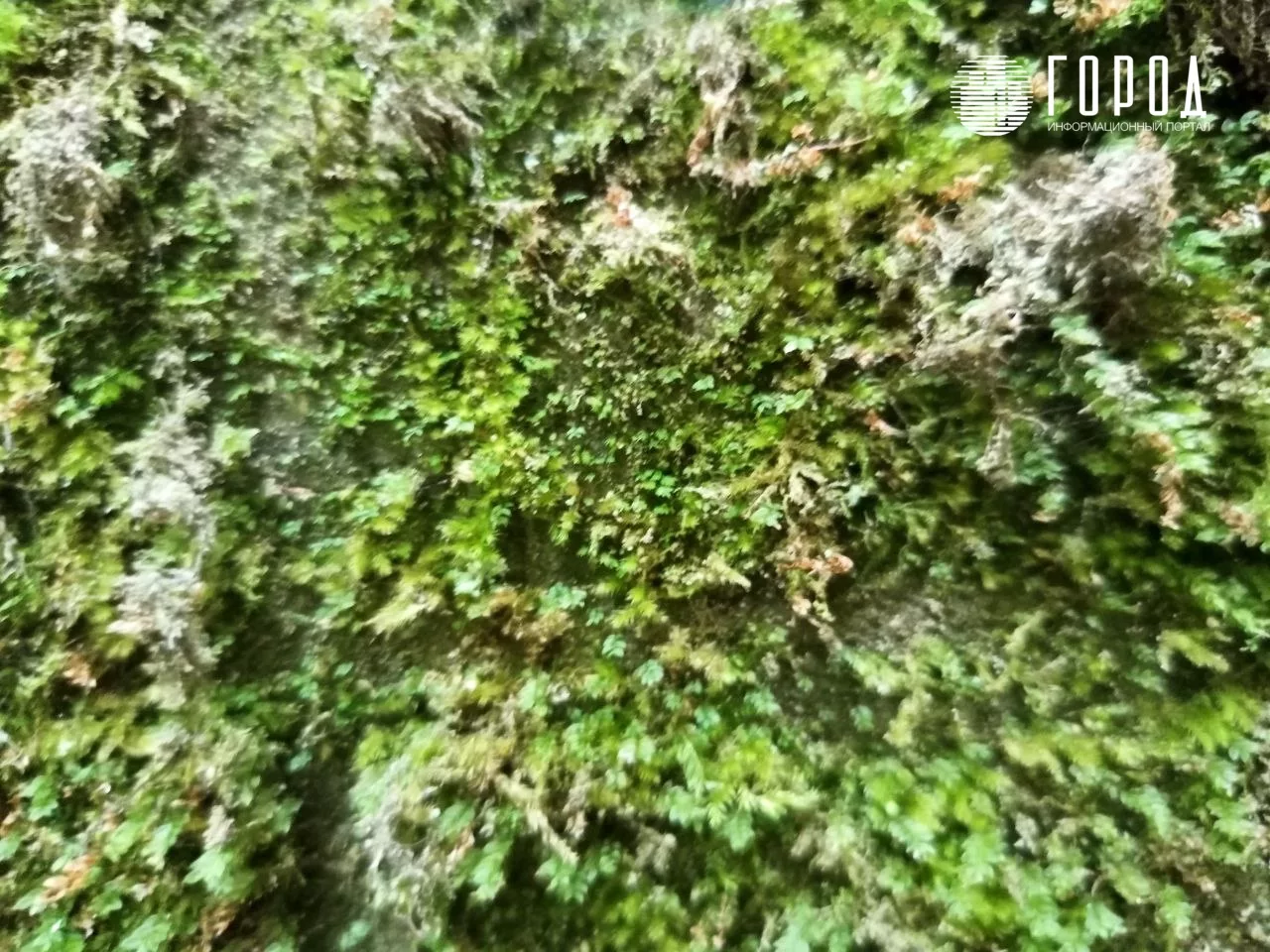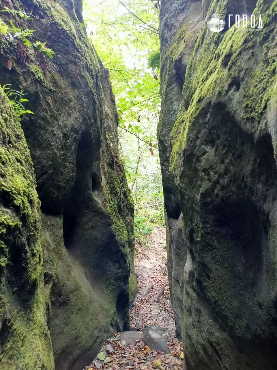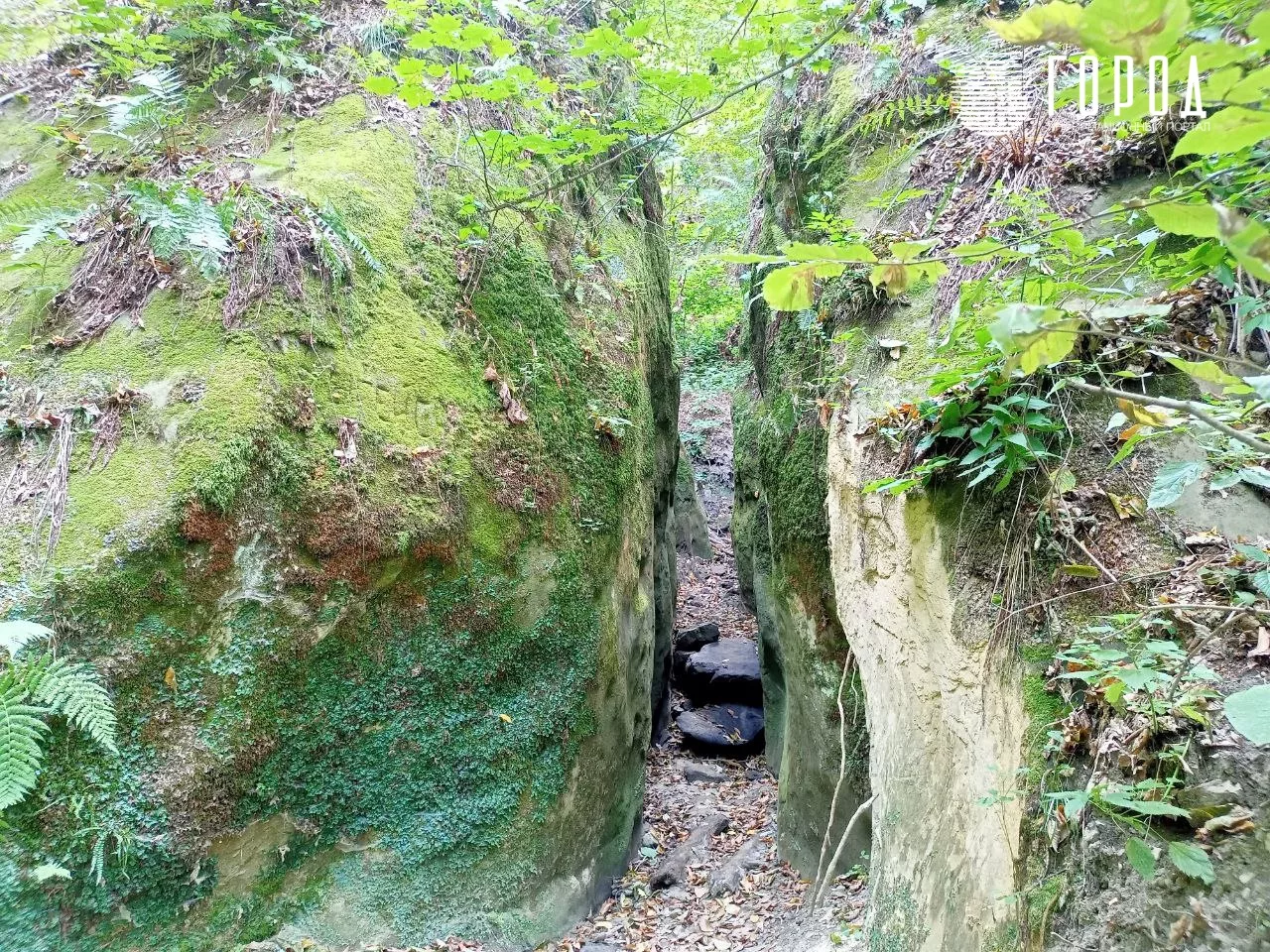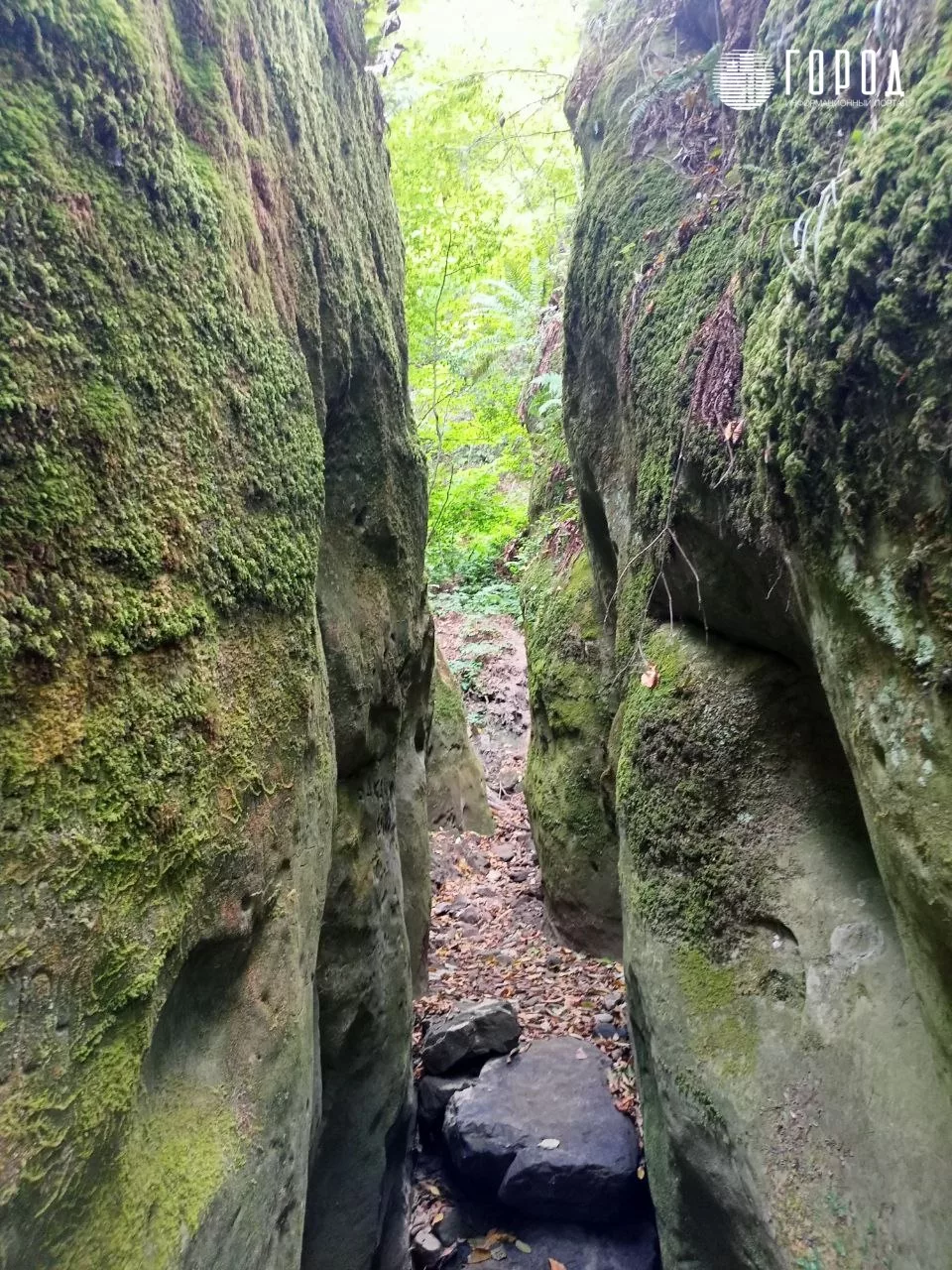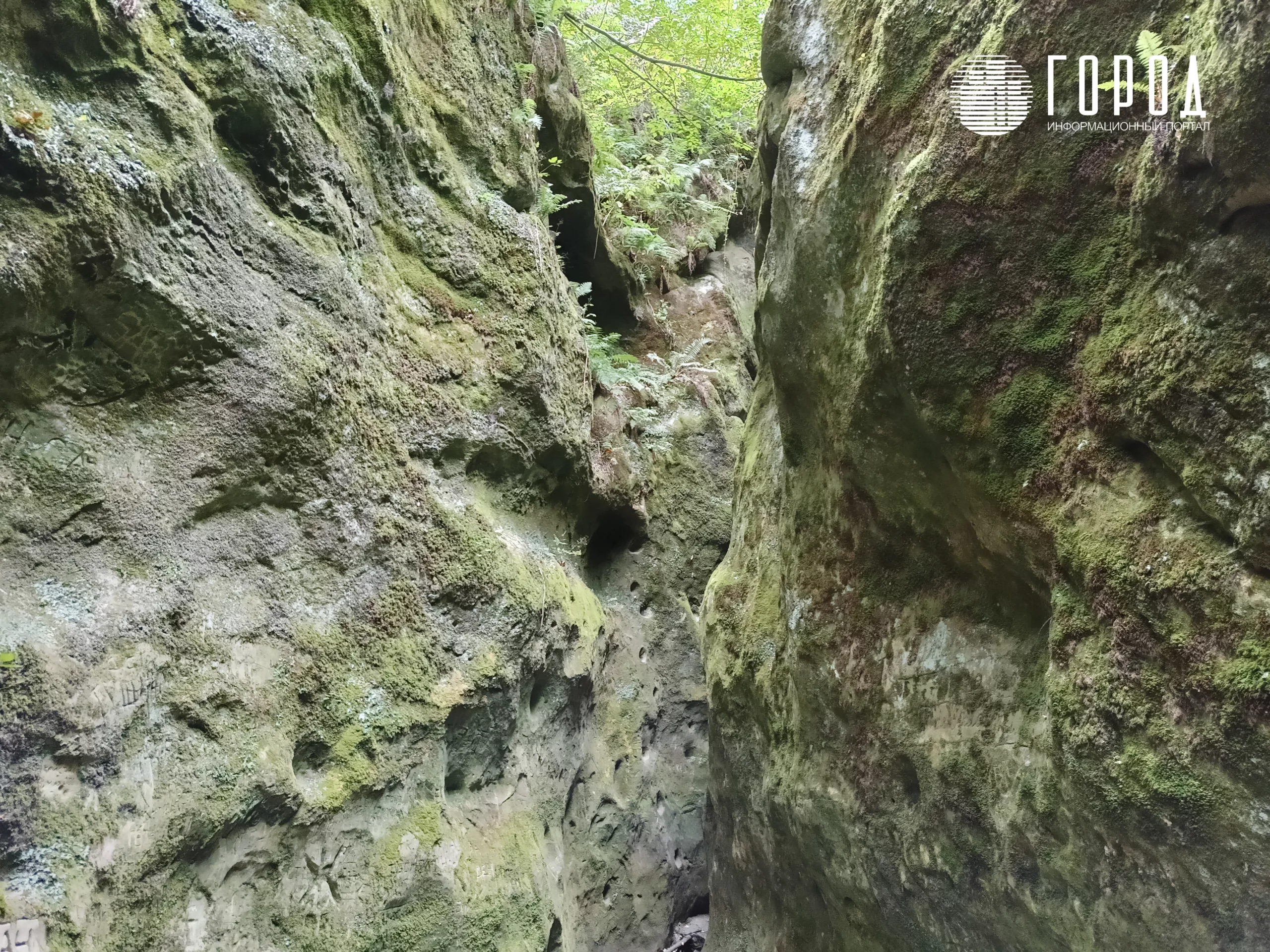 Две скалы, между которыми узкая расщелина. Небольшой ручеёк между ними, который легко обойти между двух скал, благодаря веткам. Яркие зелёные краски самого разнообразного растущего мха и грибка играют причудливыми мотивами.