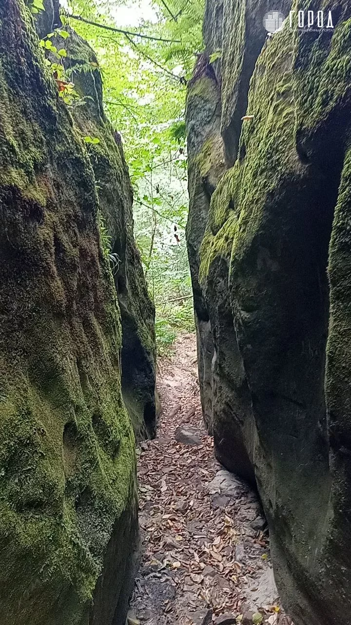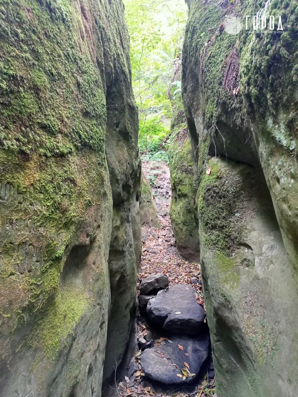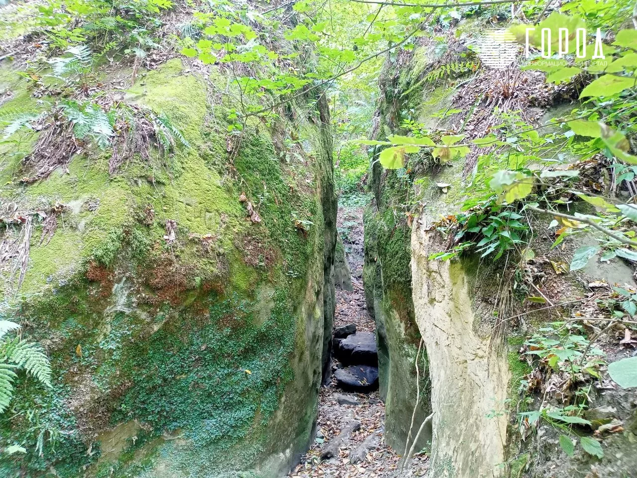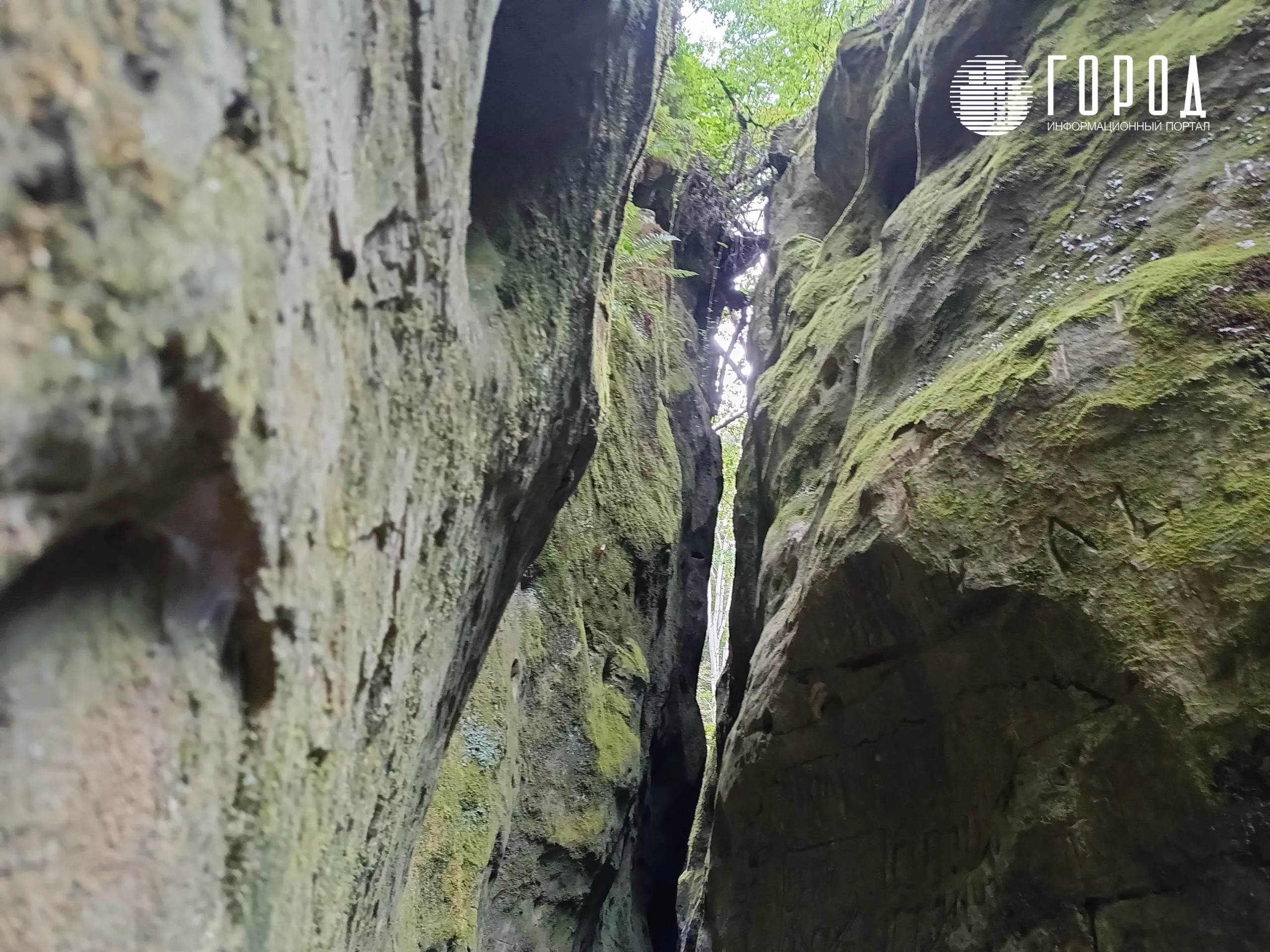 Две скалы, между которыми узкая расщелина. Небольшой ручеёк между ними, который легко обойти между двух скал, благодаря веткам. Яркие зелёные краски самого разнообразного растущего мха и грибка играют причудливыми мотивами.