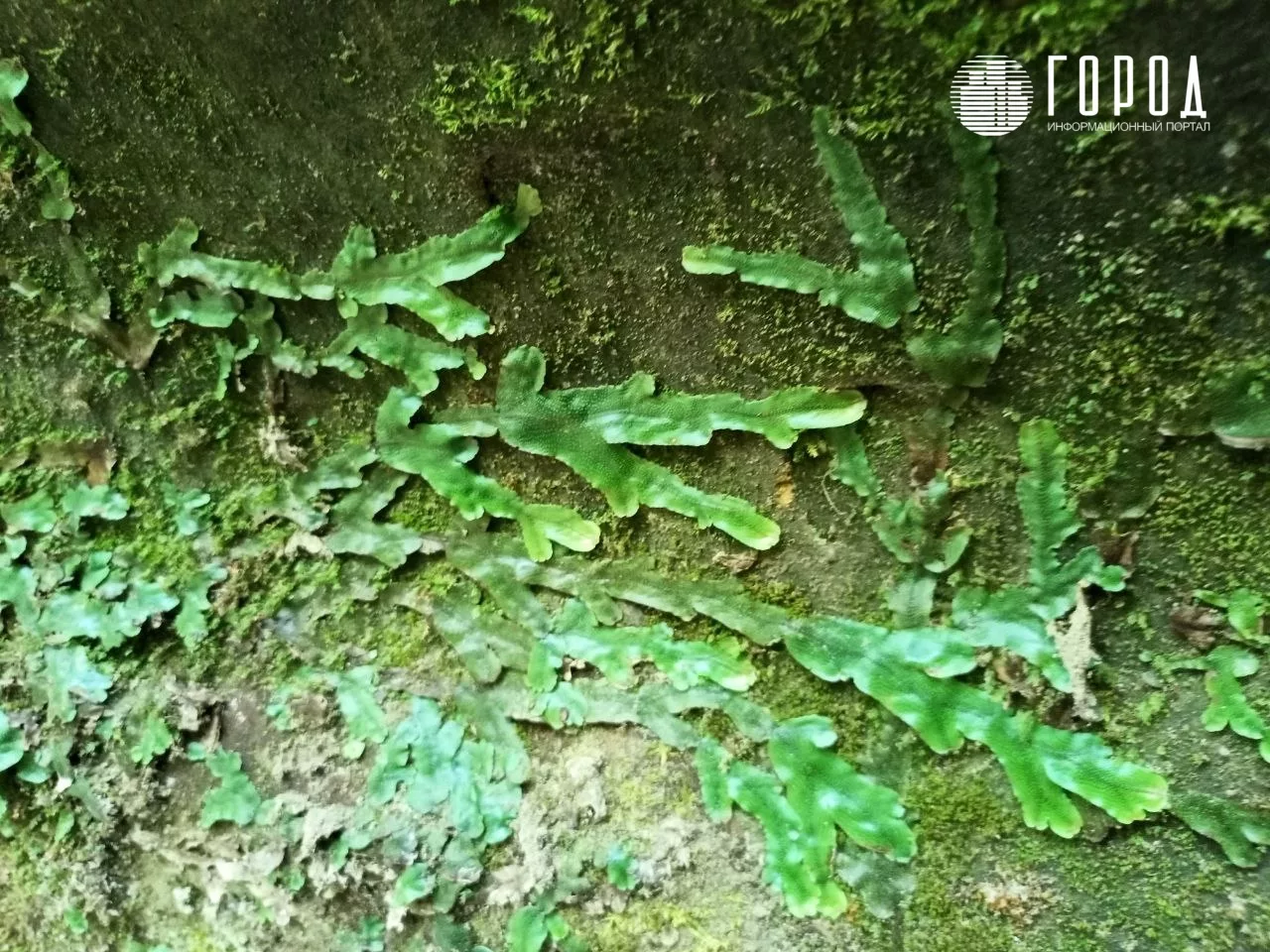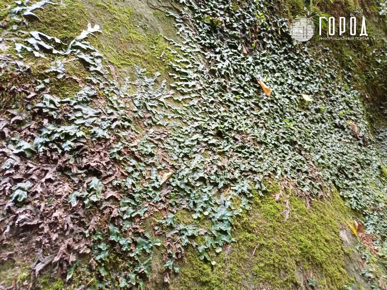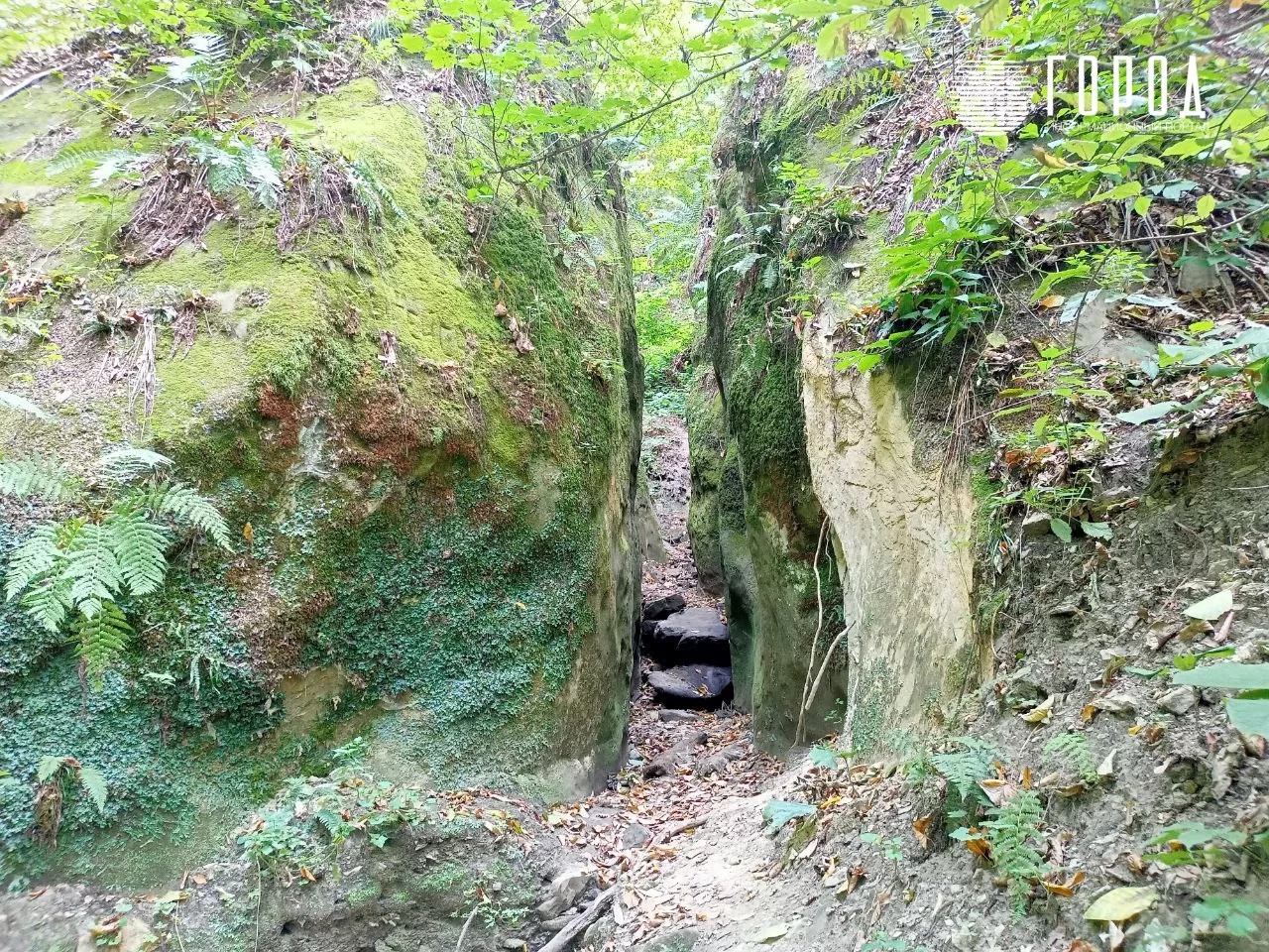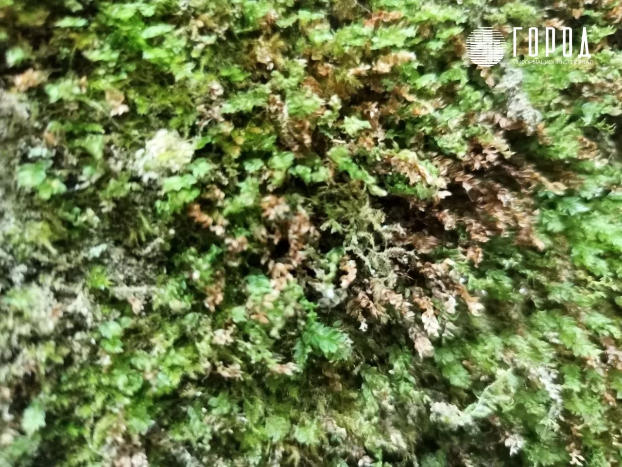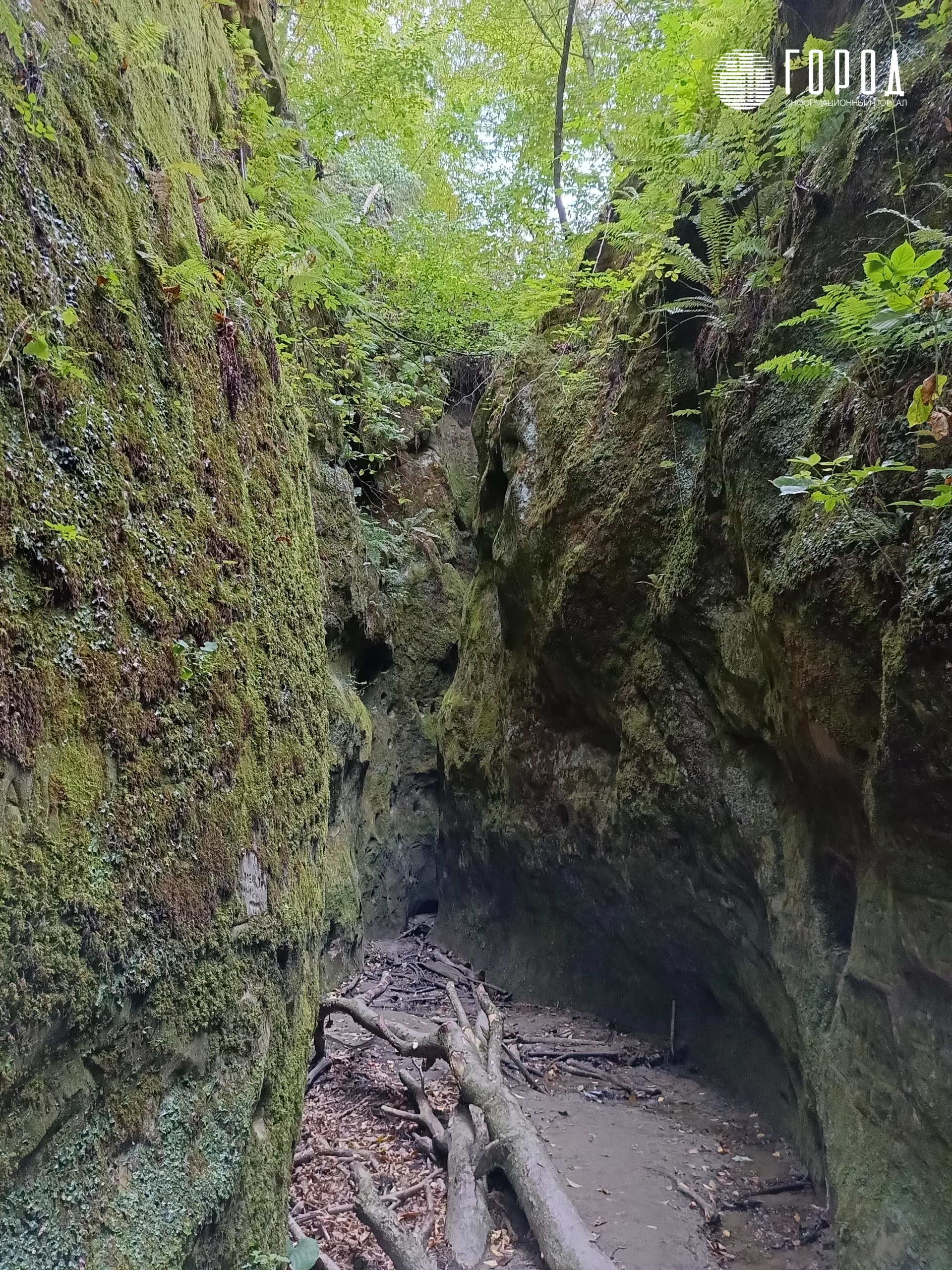 Две скалы, между которыми узкая расщелина. Небольшой ручеёк между ними, который легко обойти между двух скал, благодаря веткам. Яркие зелёные краски самого разнообразного растущего мха и грибка играют причудливыми мотивами.