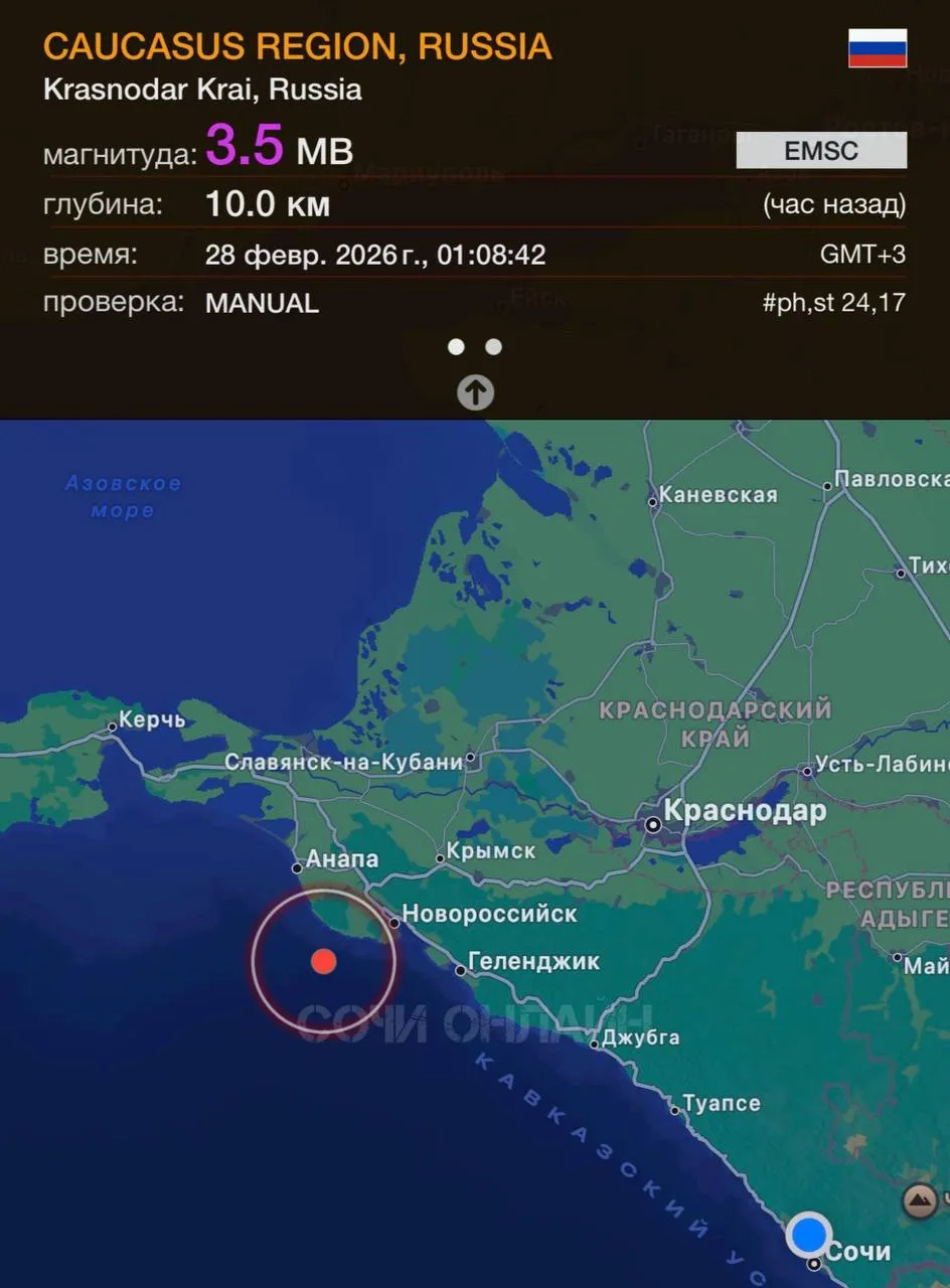 В Краснодарском крае ночью 28 февраля между Анапой и Новороссийском произошло землетрясение магнитудой 3,5 балла по шкале Рихтера.