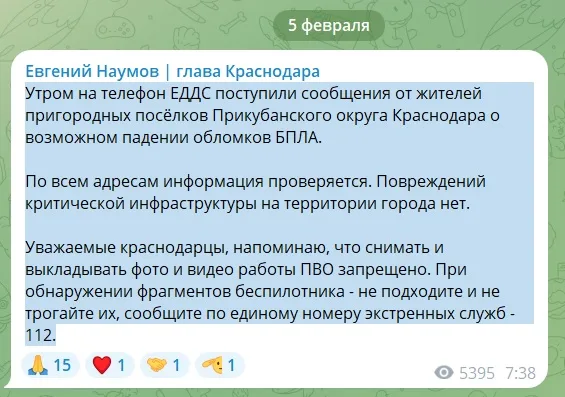 В 6:09 Росавиация отменила введённые ограничения на полёты в аэропорту Краснодара. В восьмом часу жителям стали приходить смс-сообщения об отмене беспилотной опасности. И только тогда последовало хоть какое-то объяснение властей о произошедшем. Глава Краснодара Евгений Наумов в 7:38 поведал, что «поступили сообщения от жителей пригородных посёлков Прикубанского округа Краснодара о возможном падении обломков БПЛА». Сейчас всю информацию проверяют, а «повреждений критической инфраструктуры на территории города нет». Комментарий мэра появился, когда в Сети уже появилось много фото и видео увиденного ночью. И заявление Евгения Наумова было, мягко скажем, опоздавшим и неинформативным.